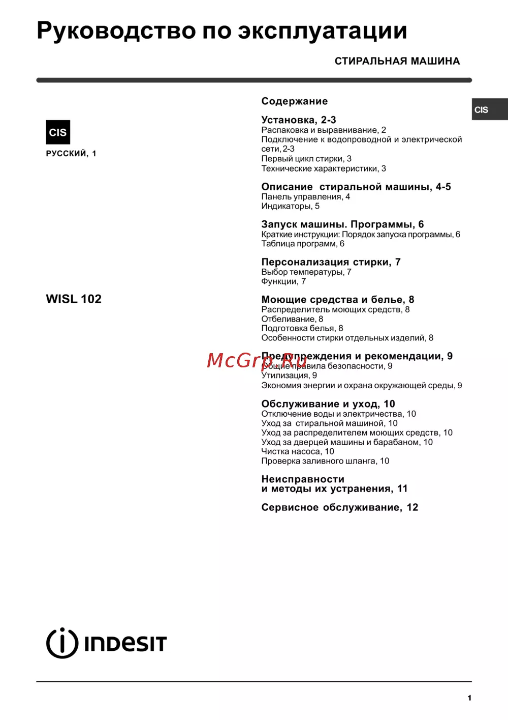 Руководство по эксплуатации СТИРАЛЬНАЯ МАШИНА Содержание ОБ Установка 2 3 С1Б РУССКИЙ 1 Распаковка и выравнивание 2 Подключение к водопроводной и электрической сети 2 3 Первый цикл стирки 3 Технические характеристики 3 Описание стиральной машины 4 5 Панель управления 4 Индикаторы 5 Запуск машины Программы 6 Краткие инструкции Порядок запуска программы 6 Таблица программ 6 Персонализация стирки 7 Выбор температуры 7 Функции 7 WISL102 Моющие средства и белье 8 Распределитель моющих средств 8 Отбеливание 8 Подготовка белья 8 Особенности стирки отдельных изделий 8 Предупреждения и рекомендации 9 Общие правила безопасности 9 Утилизация 9 Экономия энергии и охрана окружающей среды 9 Обслуживание и уход 10 Отключение воды и электричества 10 Уход за стиральной машиной 10 Уход за распределителем моющих средств 10 Уход за дверцей машины и барабаном 10 Чистка насоса 10 Проверка заливного шланга 10 Неисправности и методы их устранения 11 Сервисное обслуживание 12 ф шое51т 1