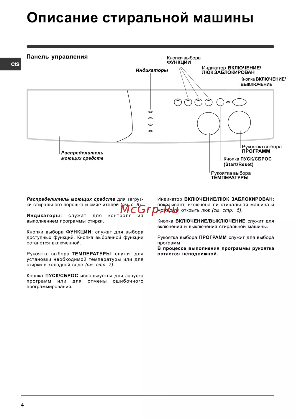 Описание стиральной машины ТЕМПЕРАТУРЫ Распределитель моющих средств для ки стирального порошка и смягчителей см с 8 Индикаторы служат для выполнением программы стирки загруз контроля за Кнопка ВКЛЮЧЕНИЕ ВЫКЛЮЧЕНИЕ служит включения и выключения стиральной машины Кнопки выбора ФУНКЦИИ служат для выбора доступных функций Кнопка выбранной функции останется включенной Рукоятка выбора ТЕМПЕРАТУРЫ служит установки необходимой температуры или стирки в холодной воде см стр 7 Кнопка ПУСК СБРОС используется программ или для отмены программирования 4 Индикатор ВКЛЮЧЕНИЕ ЛЮК ЗАБЛОКИРОВАН показывает включена ли стиральная машина и можно ли открыть люк см стр 5 для для для запуска ошибочного для Рукоятка выбора ПРОГРАММ служит для выбора программ В процессе выполнения программы рукоятка остается неподвижной