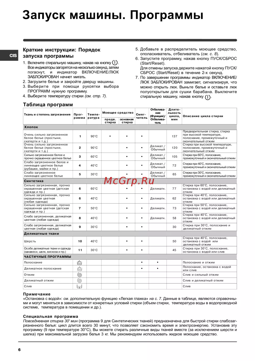 Запуск машины Программы 5 Краткие инструкции Порядок запуска программы СБ 1 Включите стиральную машину нажав на кнопку Все индикаторы загорятся на несколько секунд затем погаснут и индикатор ВКЛЮЧЕНИЕ ЛЮК ЗАБЛОКИРОВАН начнет мигать 2 Загрузите белье и закройте дверцу машины 3 Выберите при помощи рукоятки выбора ПРОГРАММ нужную программу 4 Выберите температуру стирки см стр 7 Добавьте в распределитель моющее средство ополаскиватель отбеливатель см с 8 6 Запустите программу нажав кнопку ПУСК СБРОС 81аг1 Резе1 Для отмены запуска держите нажатой кнопку ПУСК СБРОС Б1аг1 Резе1 в течение 2 х секунд 7 По завершении программы индикатор ВКЛЮЧЕНИЕ ЛЮК ЗАБЛОКИРОВАН замигает сигнализируя что можно открыть люк Выньте белье и оставьте люк полуоткрытым для сушки барабана Выключите стиральную машину нажав кнопку Таблица программ Ткань и степень загрязнения Прог рамма Температура Моющее средство предв стирка основная стирка Смя гчитель Отбеливание Функция Отбелива тель Длительность цикла мин Описание цикла стирки Хлопок Очень сильно загрязненное белое белье простыни скатерти и т д Очень сильно загрязненное белое белье простыни скатерти и т д Сильно загрязненное белое и прочно окрашэнное цветное белье Слабо загрязненное белое и линяюшре цветное белье рубашки майки и пр Слабо загрязненное линяющее цветное белье 137 Предварительная стирка стирка при высокой температуре полоскание промежуточный и окончательный отжим Стирка при высокой температуре полоскание промежуточный и окончательный отжим Стирка при 60 С полоскание промежуточный и окончательный отжим 1 90 С 2 90 С Деликат Обычный 120 3 60 С Деликат Обычный 105 4 40 С Деликат Обычный 72 Стирка при 40 С полоскание промежуточный и окончательный отжим 5 ЗО С Деликат Обычный 65 Стирка при ЗО С полоскание промежуточный и окончательный отжим 6 60 С Деликатн 77 6 40 С Деликатн 62 7 50 С Деликатн 73 Слабо загрязненная деликатная цветная любая одежда 8 40 С Деликатн 58 Слабо загрязненная деликатная цветная любая одежда 9 ЗО С 30 Шерсть 10 40 С 50 Особо деликатные ткани и одежда занавеси пел к вискоза и пр 11 ЗО С 45 Синтетика Сильно загрязненная прочно окрашенная цветная детская одежда и пр Сильно загрязненная прочно окрашенная цветная любая одежда Сильно загрязненная прочно окрашенная цветная детская одежда и пр Стирка при 60 С полоскание остановка с водой или деликатный отжим Стирка при 40 С полоскание остановка с водой или деликатный отжим Стирка при 50 С полоскание остановка с водой или деликатный отжим Стирка при 40 С полоскание остановка с водой или деликатный отжим Стирка при ЗО С полоскание и деликатный отжим Деликатные ткани Стирка при 40 С полоскание остановка с водой или деликатный отжим Стирка при ЗО С полоскание остановка с водой или слив ЧАСТИЧНЫЕ ПРОГРАММЫ Полоскание Деликатное полоскание Й Отжим Слив и сильный отжим Деликатный отжим Слив и деликатный отжим Слив Полоскание и отжим Полоскание остановка с водой или слив Слив Примечание Остановка с водой см дополнительную функцию Легкая глажка на с 7 Данные в таблице являются справочны ми и могут меняться в зависимости от конкретных условий стирки объем стирки температура воды в водопроводной системе температура в помещении и др Специальная программа Повседневная стирка 30 мин программа 9 для Синтетических тканей предназначена для быстрой стирки слабозаг