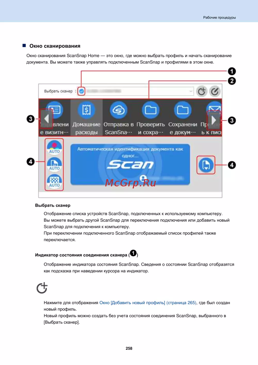 документа. Вы можете также управлять подключенным ScanSnap и профилями в этом окне.