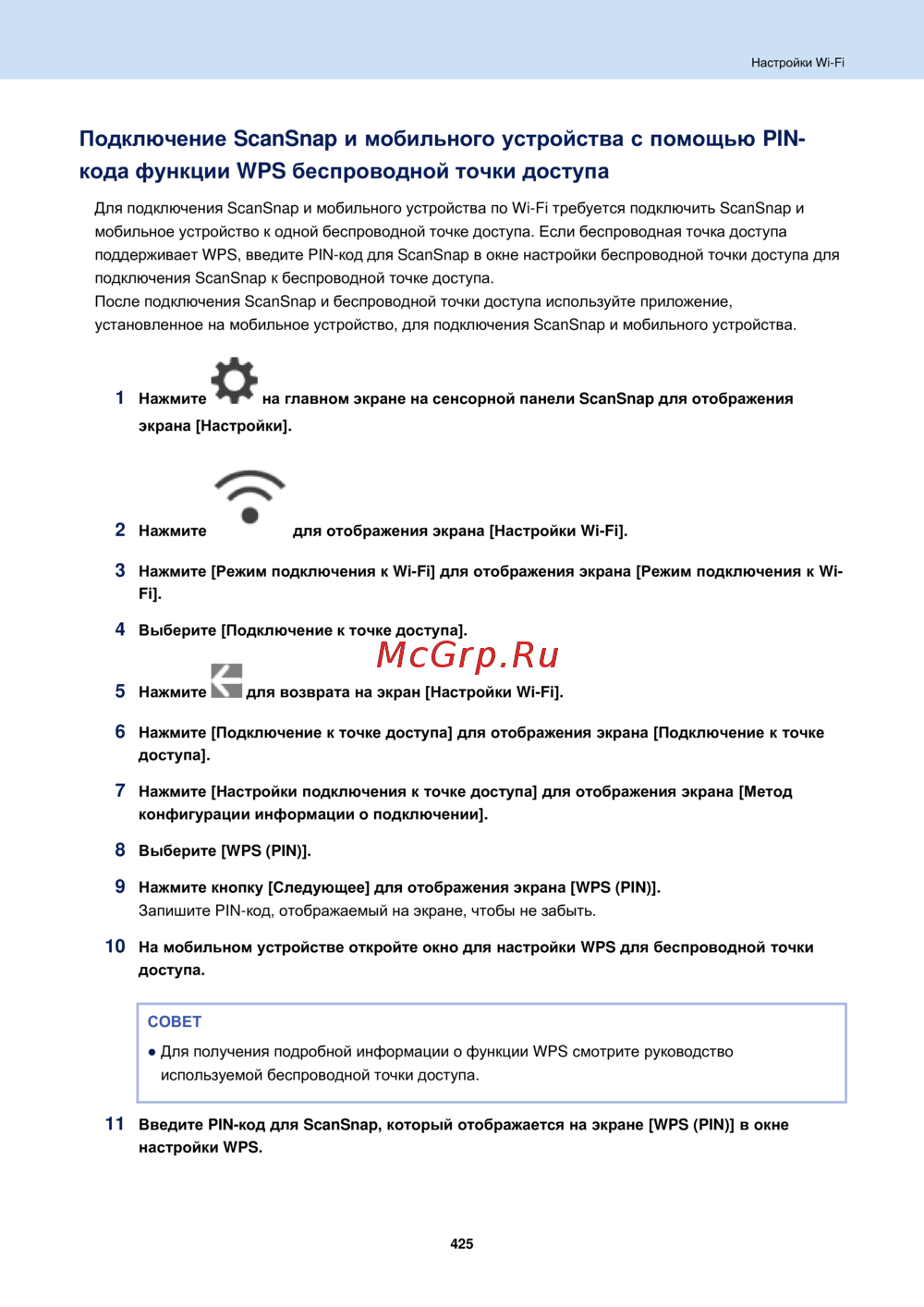 Fujitsu ScanSnap iX1500 — настройки Wi-Fi: Подключение устройств через WPS и PIN-код [425/638]