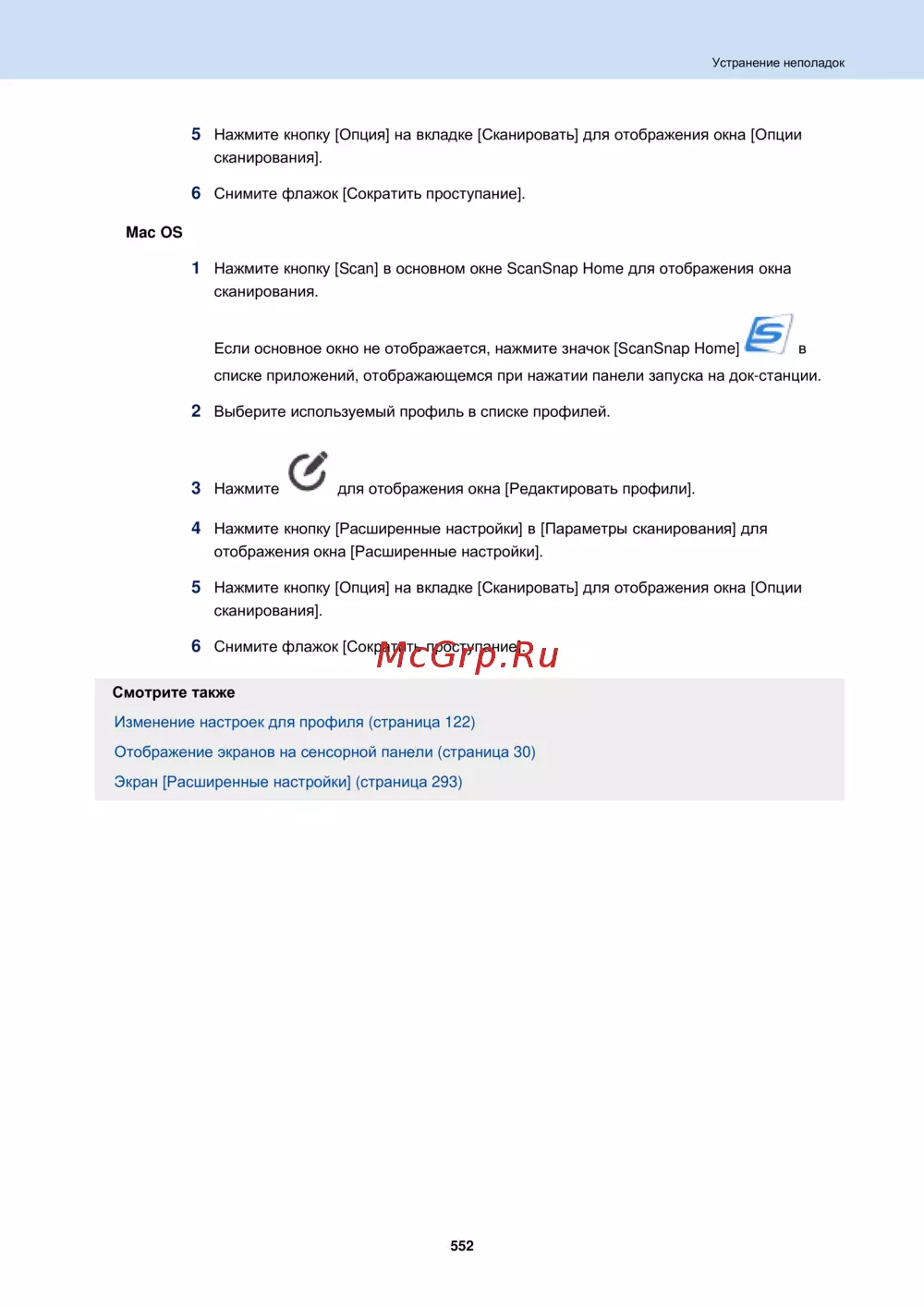 - Кнопка scan недоступна даже при выборе значка профиля на сенсорной панели scansnap p.504