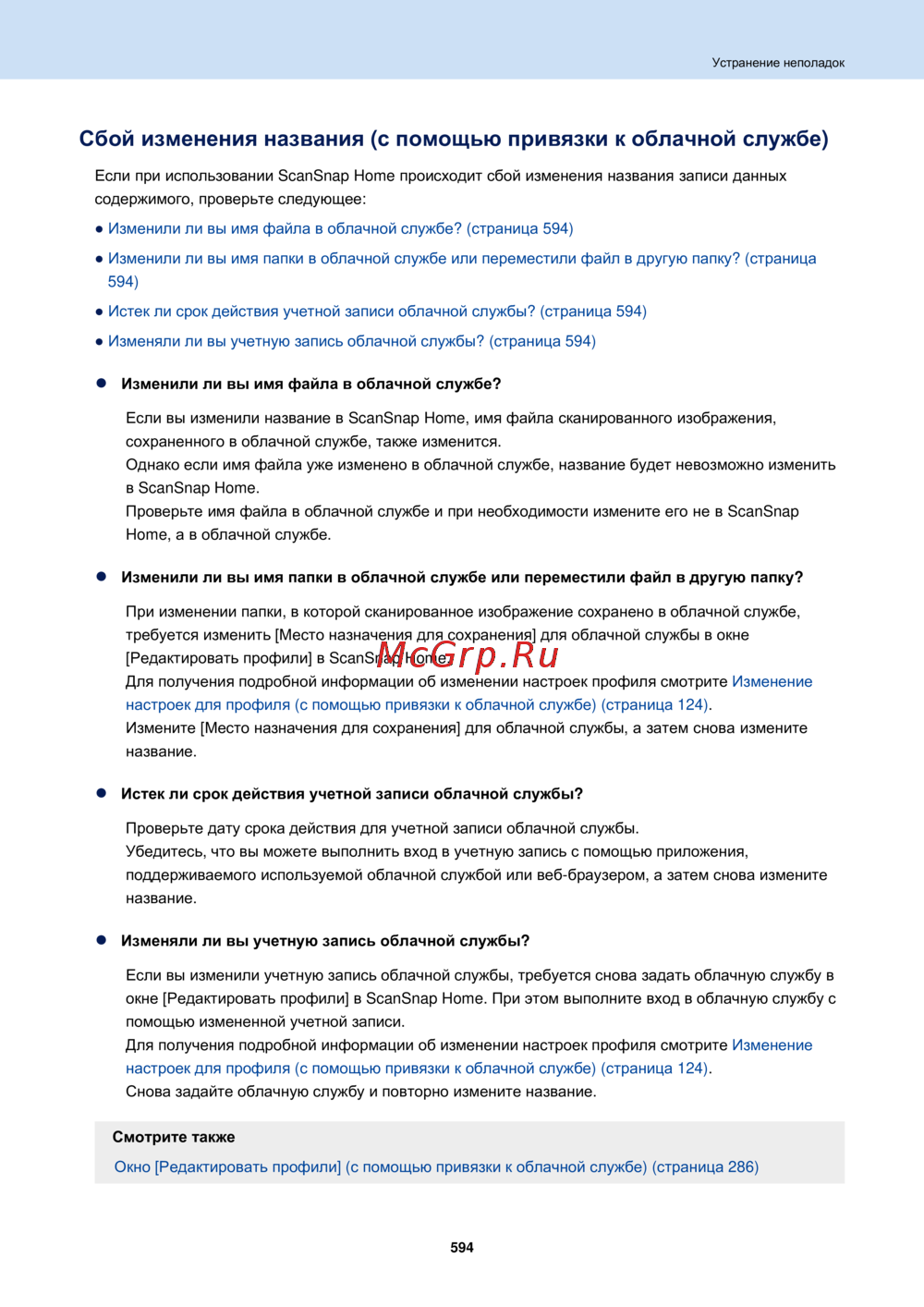 - Scansnap не подключен к сети с помощью привязки к облачной службе p.584