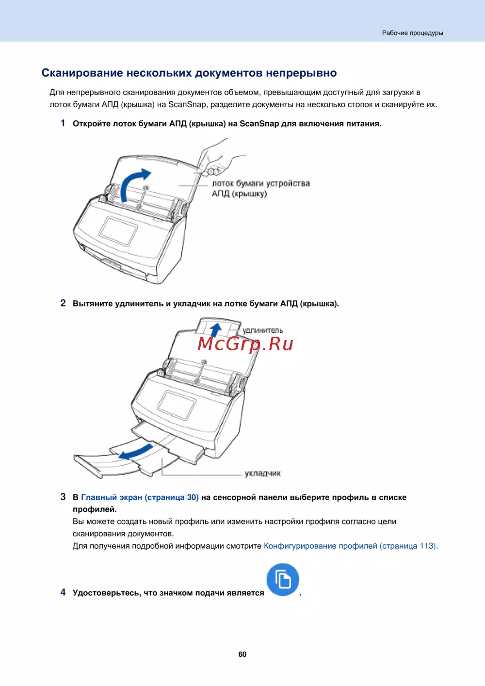 Для непрерывного сканирования документов объемом, превышающим доступный для загрузки в