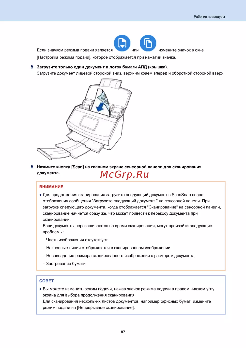 сканирование начнется сразу же, что может привести к перекосу документа при