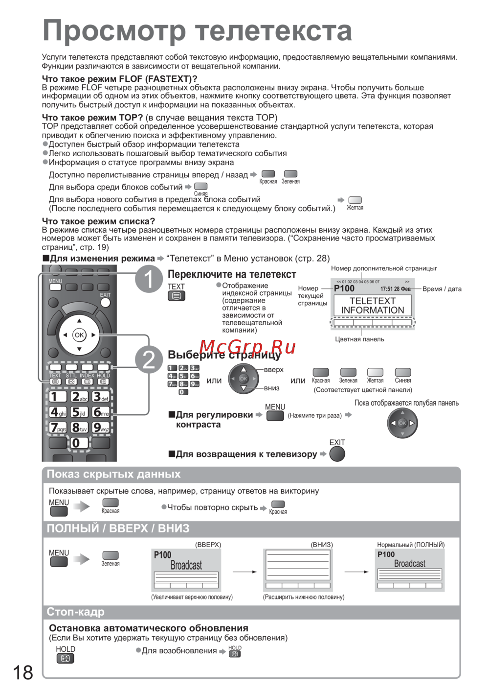 Узнайте о функциях телетекста, режимах FLOF и TOP, а также о том, как легко управлять информацией на экране. Получите доступ к полезным данным быстро и удобно.