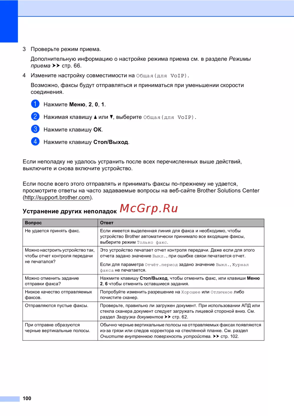 - Если после всего этого отправлять и принимать факсы по прежнему не удается просмотрите ответы на часто задаваемые вопросы на веб сайте brother solutions center http support brother com p.109