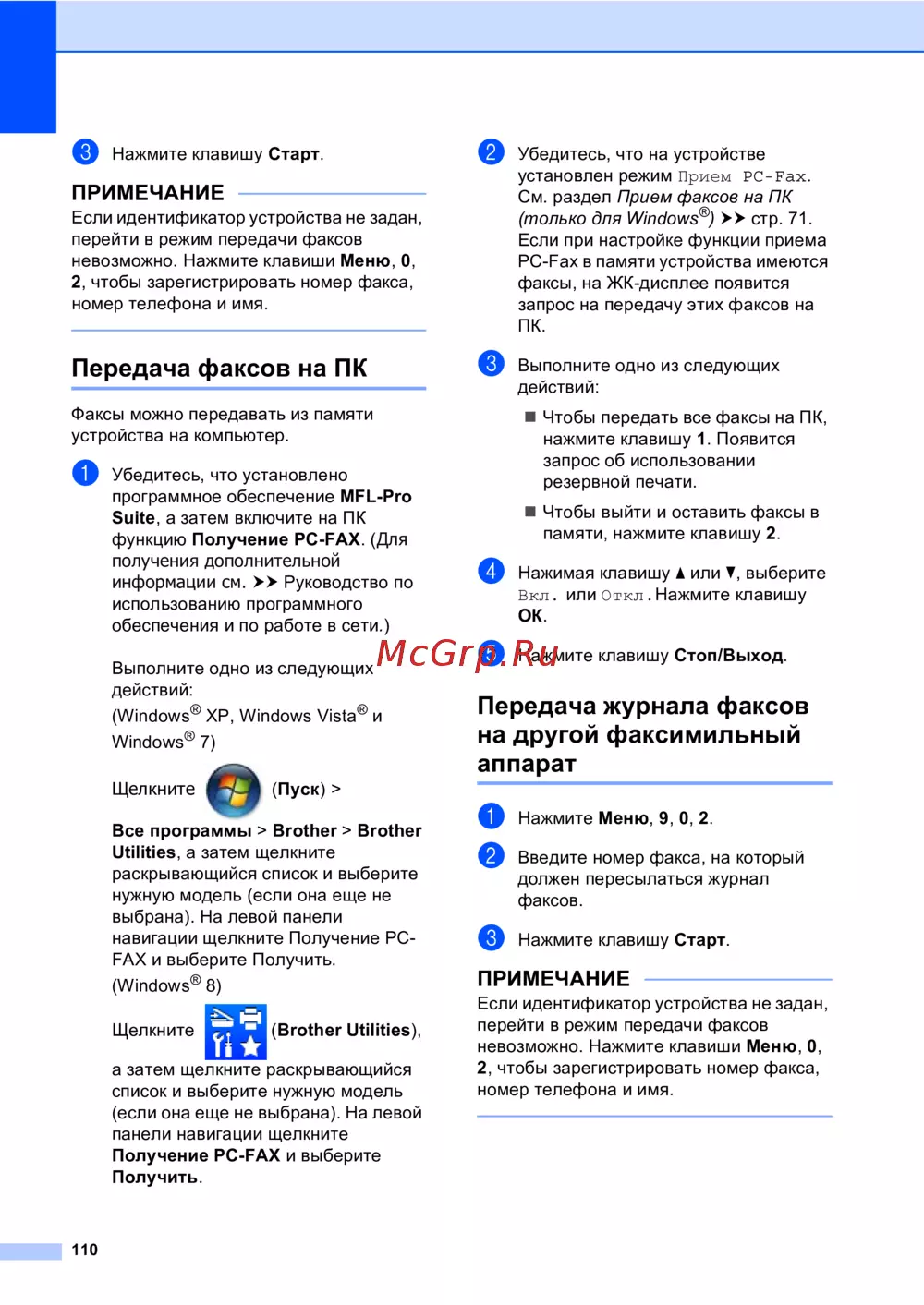 - Передача факсов или журнала факсов на другое устройство модели mfc p.118