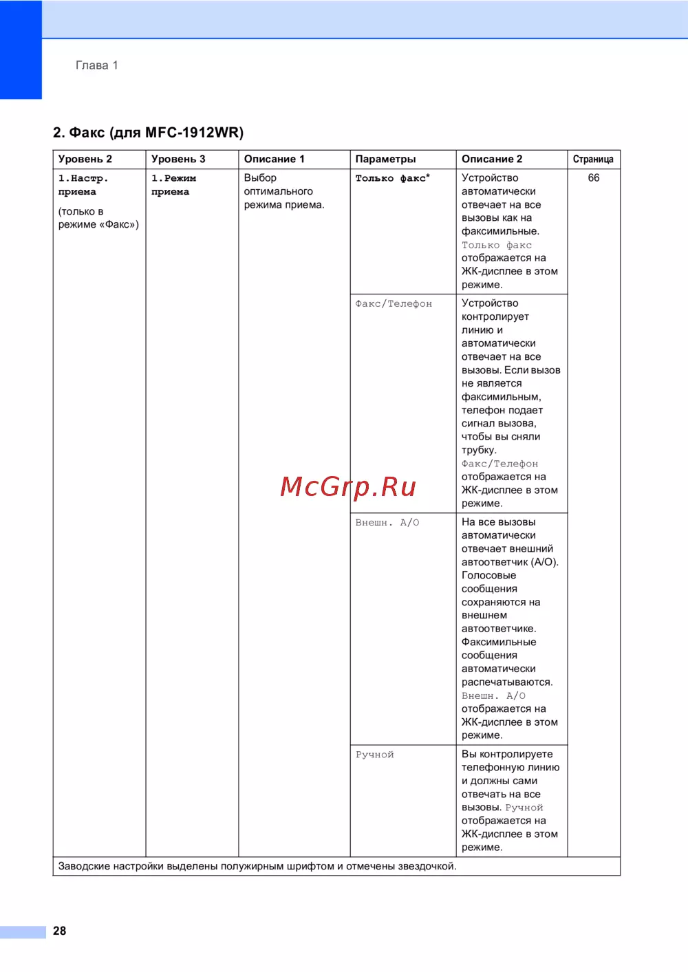 Заводские настройки выделены полужирным шрифтом и отмечены звездочкой.