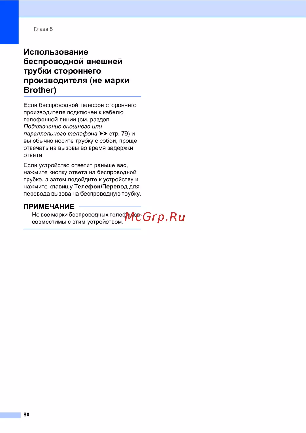 - Использование беспроводной внешней трубки стороннего производителя не марки brother p.89
