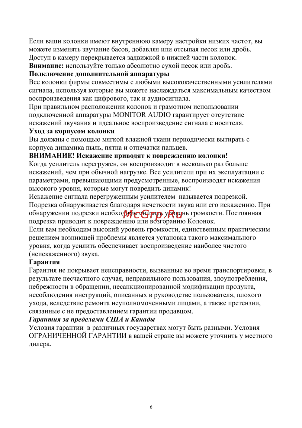 подключенной аппаратуры MONITOR AUDIO гарантирует отсутствие