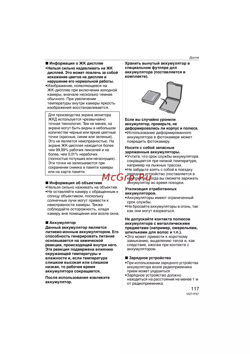 Panasonic DMC-FX100EES — рекомендации по уходу за ЖК-дисплеем и аккумулятором камеры [117/167]