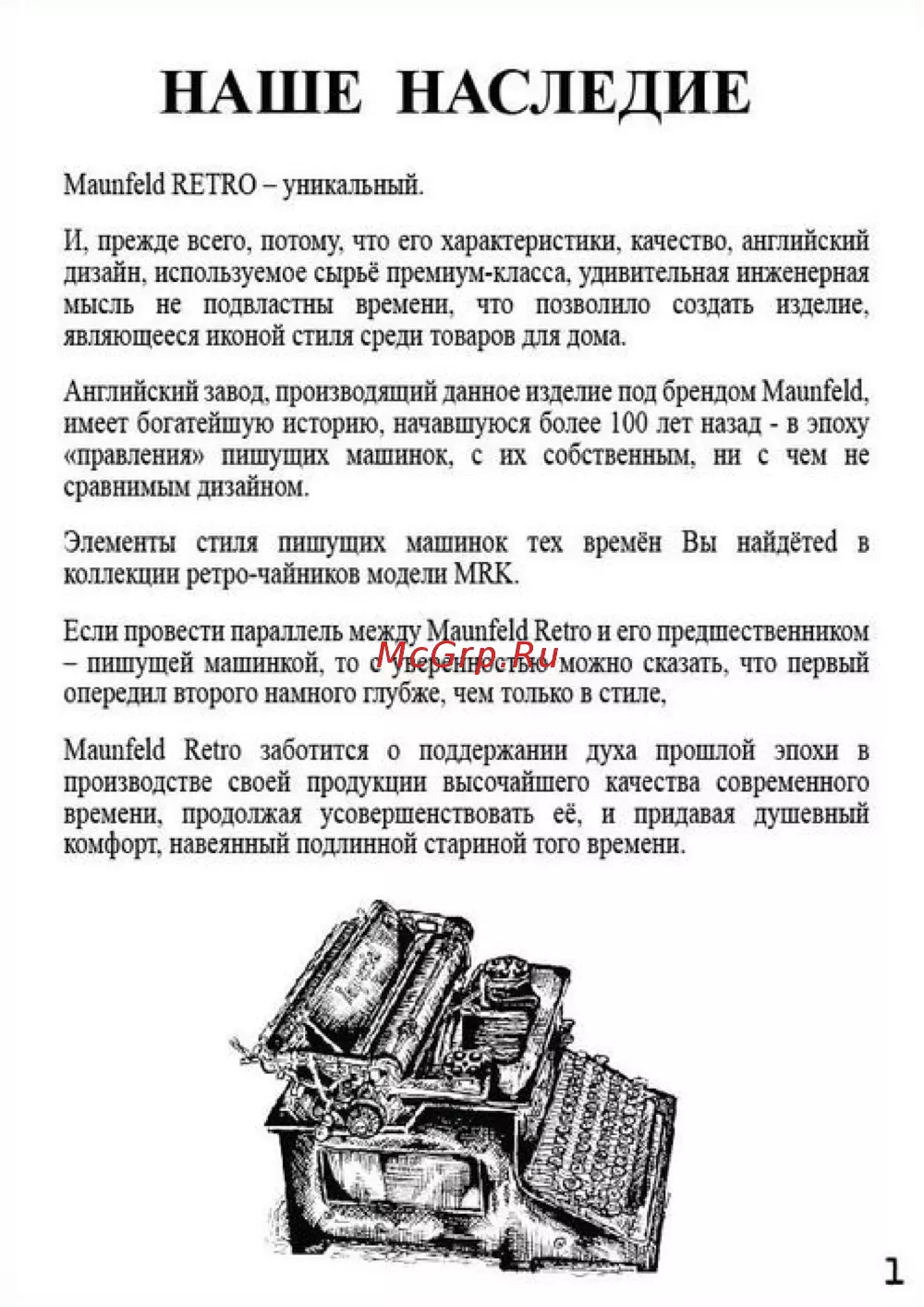 НАШЕ НАСЛЕДИЕ Maunfeld RETRO уникальный И прежде всего потому что его характеристики качество английский дизайн используемое сырьё премиум класса удивительная инженерная мысль не подвластны времени что позволило создать изделие являющееся иконой стиля среди товаров для дома Английский завод производящий данное изделие под брендом Maunfeld имеет богатейшую историю начавшуюся более 100 лет назад в эпоху правления пип ущих машинок с их собственным ни с чем не сравнимым дизайном Элементы стиля пишущих машинок тех времён Вы найдётеб в коллекции ретро чайников модели МКК Если провести параллель между Maunfeld Retro и его пре ественником пишущей машинкой то с уверенностью можно сказать что первый опередит второго намного глубже чем только в стиле Maunfeld Retro заботится о поддержании духа прошлой эпохи в производстве своей продукции высочайшего качества современного времени продолжая усовершенствовать её и придавая душевный комфорт навеянный подлинной стариной того времени 1