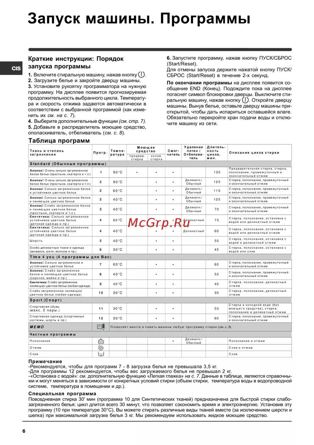 Запуск машины Программы Краткие инструкции Порядок запуска программы CIS 6 Запустите программу нажав кнопку ПУСК СБРОС Start Reset Для отмены запуска держите нажатой кнопку ПУСК СБРОС Start Reset в течение 2 х секунд 1 Включите стиральную машину нажав кнопку _ 2 Загрузите белье и закройте дверцу машины 3 Установите рукоятку программатора на нужную программу На дисплее появится прогнозируемая продолжительность выбранного цикла Температу ра и скорость отжима задаются автоматически в соответствии с выбранной программой как изме нить их см на с 7 4 Выберите дополнительные функции см стр 7 5 Добавьте в распределитель моющее средство ополаскиватель отбеливатель см с 8 По окончании программы на дисплее появится со общение END Конец Подождите пока на дисплее погаснет символ блокировки дверцы Выключите сти ральную машину нажав кнопку Q Откройте дверцу машины Вынув белье оставьте дверцу машины при открытой чтобы дать испариться оставшейся влаге Обязательно перекройте кран подачи воды и отклю чите машину из сети Таблица программ Ткань и степень загрязнения Про гр Температура Моющее средство предвар стирка основ стирка Смягчитель Удаление пятен Отбели ва те ль Дли тельно сть ци кла мин Описание цикла стирки Standard Обычные программы 135 Предварительная стирка стирка полоскание промежуточный и окончательный отжим Деликатн Обычный 125 Стирка полоскание промежуточный и окончательный отжим 60 С Деликатн Обычный 110 Стирка полоскание промежуточный и окончательный отжим 2 40 С Деликатн Обычный 105 Стирка полоскание промежуточный и окончательный отжим 3 40 С Деликатн Обычный 70 Стирка полоскание промежуточный и окончательный отжим 4 60 С Деликат ный 75 Стирка полоскание остановка с водой или деликатный отжим 4 40 С Деликат ный 60 Стирка полоскание остановка с водой или деликатный отжим Шерсть 5 40 С 50 Стирка полоскание остановка с водой и деликатный отжим Особо деликатные ткани и одежда занавеси шелк вискоза и пр 6 ЗО С 45 Стирка полоскание остановка с водой или слив 7 60 С 60 Стирка полоскание промежуточный и окончательный отжим 8 40 С 50 Стирка полоскание промежуточный и окончательный отжим Синтетика Слабо загрязненное линяющее цветное белье любая одежда 9 40 С 40 Стирка полоскание деликатный отжим Слабо загрязненное линяющее цветное белье любая одежда 10 ЗО С 30 Стирка полоскание деликатный отжим Спортивная обувь макс 2 пары 11 ЗО С 50 Стирка в холодной воде без моющего средства стирка полоскание и деликатный отжим Спортивная одежда спортивные костюмы шорты и пр 12 ЗО С 60 Стирка полоскание промежуточный и окончательный отжим Хлопок Очень сильно загрязненное белое белье простыни скатерти и т п 1 90 С Хлопок Очень сильно загрязненное белое белье простыни скатерти и т п 2 90 С Хлопок Сильно загрязненное белое и устойчивое цветное белье 2 Хлопок Сильно загрязненное белое и линяющее цветное белье Хлопок Слабо загрязненное белое и линяющее цветное белье простыни скатерти и т п Синтетика Сильно загрязненное устойчивое цветное белье детская одежда и пр Синтетика Сильно загрязненное устойчивое цветное белье детская одежда и пр Time 4 you 4 программы для Вас Хлопок Сильно загрязненное и устойчивое цветное белье Хлопок Слабо загрязненное белое и линяющее цветное белье сорочки майки и пр МЕМО а Sport Спорт Позволяет ввести в память машины любую программу стирки см С 5 Частные программы 