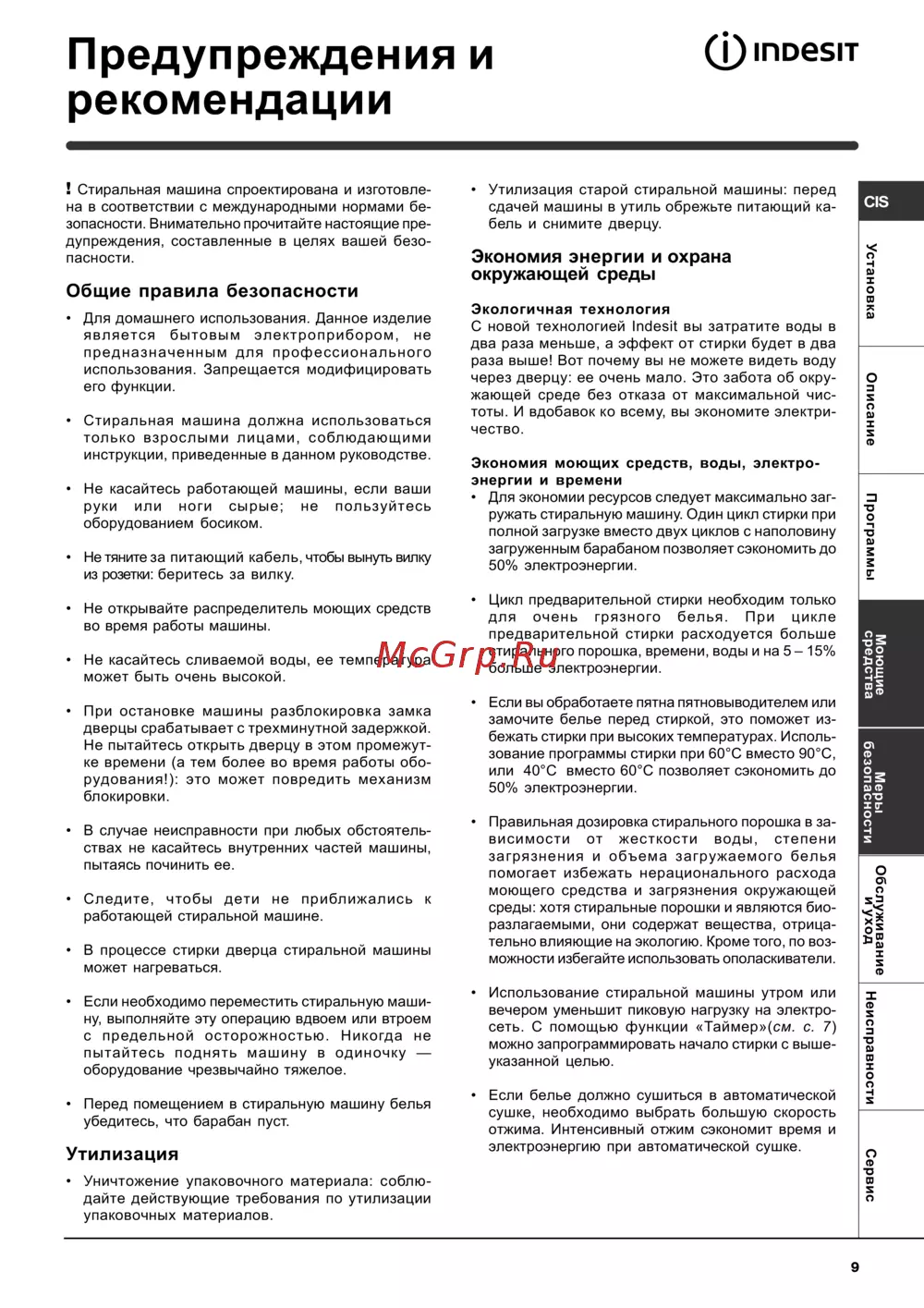 Indesit WISE 10 CSI — предупреждения и рекомендации по безопасному использованию стиральной машины [9/12]