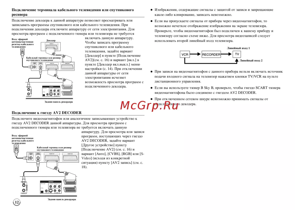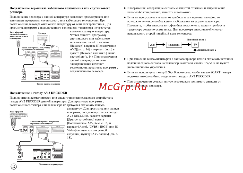 Подключение терминала кабельного телевидения или спутникового ресивера Изображения содержащие сигналы с защитой от записи и запрещающие Подключение декодера к данной аппаратуре позволяет просматривать или записывать программы спутникового или кабельного телевидения При подключении декодера отключите аппаратуру от сети электропитания Для просмотра программ с подключенного тюнера или телевизора не требуется включать данную аппаратуру Чтобы записать программу спутникового или кабельного телевидения задайте вариант Декодер в пункте Подключение АУ2 см с 16 и вариант вкл в пункте Декодер вкл выкл меню настройки с 14 При отключении данной аппаратуры от сети электропитания исчезнет возможность просмотра программ с подключенного декодера Если вы пропускаете сигналы от прибора через видеомагнитофон то возможно нечеткое отображение изображения на экране телевизора какое либо копирование записать невозможно Проверьте чтобы видеомагнитофон был подключен к вашему прибору и телевизору согласно схеме ниже Для просмотра видеозаписей следует использовать второй линейный вход телевизора Л инеИныМ вход 1 При записи на видеомагнитофон с данной прибора нельзя включать источник подачи входного сигнала на телевизор нажатием кнопки TV VCR на пульте дистанционного управления Если вы используете тюнер В Sky В проверьте чтобы гнездо SCART тюнера видеомагнитофона было соединено с гнездом AV2 DECODER Задняя пане1ь рекордера Подключение к гнезду AV2 DECODER Подключите видеомагнитофон или аналогичное записывающее устройство к гнезду AV2 DECODER данной аппаратуры Для просмотра программ с подключенного тюнера или телевизора не требуется включать данную аппаратуру Для просмотра или записи Вход фирном программ поступающих через гнездо ангенны нас денная розегка кабельного AV2 DECODER задайте вариант те1евидения Другое устройство пункту Подключение AV2 см с 16 и вариант Авто CVBS RGB или SVideo исходя из конкретной ситуации пункту AV2 запись см с 18 При отключенном сетевом шнуре невозможно принимать сигналы от подключенного декодера