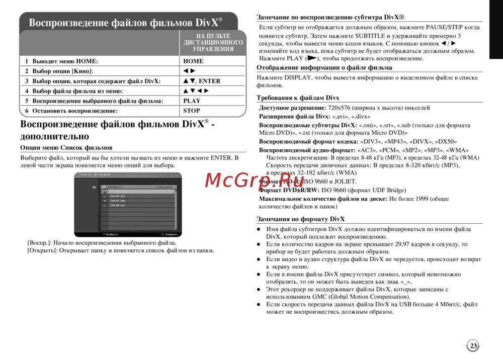 - Воспроизведение файлов фильмов divx дополнительно p.23