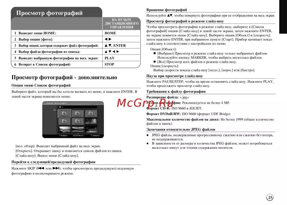 Вращение фотографий Просмотр фотографий Используйте AV чтобы повернуть фотографию при ее отображении на весь экран НА ПУЛЬТЕ л ДИСТАНЦИОННОГО УПРАВЛЕНИЯ 1 Выводит меню НОМЕ НОМЕ 2 Выбор опции фото 3 Выбор опции которая содержит файл фотографий ENTER 4 Выбор файла фотографии из списка 5 Выводит выбранную фотографии на весь экран PLAY 6 Возврат к Список фотографий STOP Просмотр фотографий дополнительно Просмотр фотографий в режиме слайд шоу Чтобы просмотреть фотографии в режиме слайд шоу выберите в Список фотографий опцию Слайд шоу в левой части экрана затем нажмите ENTER на экране появится меню Слайд шоу Выберите опции Объект и скорость затем нажмите ENTER при выбранном пункте Старт Прибор начинает показ слайд шоу в соответствии с настройками из меню Опция Объект Выбрано Просмотр в режиме слайд шоу только выбранных файлов Используйте кнопку MARKER чтобы выбрать несколько файлов Все Просмотр всех файлов в режиме слайд шоу Опция скорость Выбор скорости показа слайд шоу медл норм или быстро Пауза при просмотре слайд шоу Опции меню Список фотографий Нажмите PAUSE STEP чтобы на время остановить слайд шоу Нажмите PLAY чтобы продолжить просмотр слайд шоу Выберите файл который вы бы хотели вызвать из меню и нажмите ENTER В Требования к файлу фотографии левой части экрана появляется меню Расширение файла jpg Размер фотографии Рекомендуется не более 4 Мб Формат CD R ISO 9660 и JOLIET Формат DVD R RW ISO 9660 формат UDF Bridge Максимальное количество файлов на диске Не более 1999 общее количество файлов и папок Замечания относительно JPEG файлов пол обзор Выводит выбранный файл на весь экран Открыть Открывает папку и появляется список файлов из папки Слайд шоу Вывод меню Слайд шоу Перейти к следующей предидущей фотографии Нажмите SKIP или чтобы просмотреть предыдушую следующую фотографию в полноэкранном режиме JPEG файлы подверженные прогрессивному сжатию или сжатию без потерь не поддерживаются В зависимости от размера и количества JPEG файлов может потребоваться несколько минут для чтения содержания носителя
