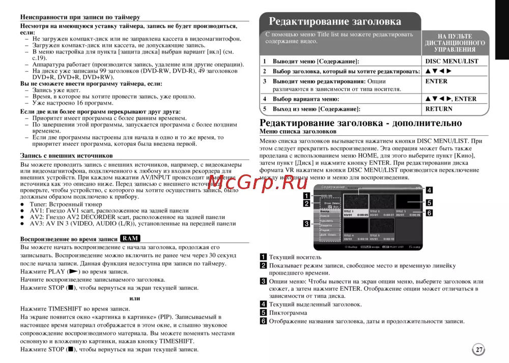 Неисправности при записи по таймеру__________________________________________ Несмотря на имеющуюся уставку таймера запись не будет производиться если Не загружен компакт диск или не заправлена кассета в видеомагнитофон Загружен компакт диск или кассета не допускающие запись В меню настройка для пункта защита диска выбран вариант вкл см с 19 Аппаратура работает производится запись удаление или другие операции На диске уже записаны 99 заголовков DVD RW DVD R 49 заголовков DVD R DVD R DVD RW Вы не сможете ввести программу таймера если Запись уже идет Время в которое вы хотите провести запись уже прошло Уже настроено 16 программ Если две или более программ перекрывают друг друга Приоритет имеет программа с более ранним временем Но завершении этой программы запускается программа с более поздним временем Если две программы настроены для начала в одно и то же время то приоритет имеет программа которая была введена первой Запись с внешних источников_________________________________________________ Вы можете проводить запись с внешних источников например с видеокамеры или видеомагнитофона подключенного к любому из входов рекордера для внешних устройств При каждом нажатии AV4NPUT происходит изменение источника как это описано ниже Перед записью с внешнего источника проверьте чтобы устройство с которого вы хотите осуществить запись было должным образом подключено к прибору Tuner Встроенный тюнер AV1 Гнездо AVI scan расположенное на задней панели AV2 Гнездо AV2 DECORDER scan расположенное на задней панели AV3 AV IN 3 VIDEO AUDIO L R установленные на передней панели Воспроизведение во время записи W________________________________________________ Вы можете начать воспроизведение с начала заголовка продолжая его записывать Воспроизведение можно включить не ранее чем через 30 секунд после начала записи Данная функция недоступна при записи по таймеру Нажмите PLAY во время записи Начните воспроизведение записываемого заголовка Нажмите STOP чтобы вернуться на экран текущей записи или Нажмите TIMESHIFF во время записи На экране появится окно картинка в картинке Р1Р Записываемый в настоящее время материал отображается в этом окне и слышно звуковое сопровождение воспроизводимого материала Вы можете поменять местами основную и вложенную картинки нажав кнопку TIMESHIFT Нажмите STOP чтобы вернуться на экран текущей записи Г 1 Редактирование заголовка С помощью меню Title list вы можете редактировать содержание видео НА ПУЛЬТЕ ДИСТАНЦИОННОГО УПРАВЛЕНИЯ 1 Выводит меню Содержание DISC MENU LIST 2 Выбор заголовка который вы хотите редактировать 3 Выводит меню редактирования Опции различаются в зависимости от типа носителя ENTER 4 Выбор варианта меню Ч ENTER 5 Выход из меню Содержание RETURN Редактирование заголовка дополнительно Меню списка заголовков Меню списка заголовков вызывается нажатием кнопки DISC MENU LIST При этом следует прекратить воспроизведение Эта операция может быть также проделана с использованием меню НОМЕ для этого выберите пункт Кино затем пункт Диск и нажмите кнопку ENTER При редактировании диска формата VR нажатием кнопки DISC MENU LIST производится переключение между исходным меню и меню для воспроизведения Текущий носитель Я Показывает режим записи свободное место и временную линейку прошедшего времени в Опции меню Чтобы вывести на экран опции меню выберите заголовок или сюжет а затем нажмите ENTER Отображение опции может отличаться в зависимости от ти