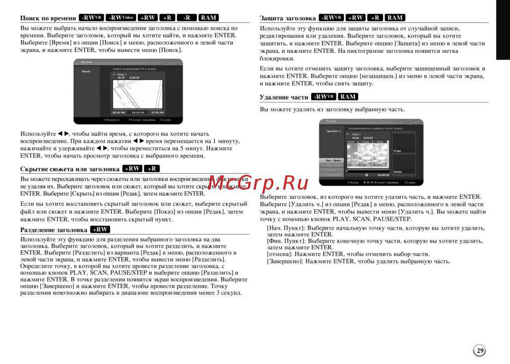 Поиск по времени RW R I RWvae В V M КУП И 4 W Вы можете выбрать начало воспроизведения заголовка с помощью поиска по времени Выберите заголовок который вы хотите найти и нажмите ENTER Выберите Время из опции Поиск в меню расположенного в левой части экрана и нажмите ENTER чтобы вывести меню Поиск Защита заголовка к RW R I ЗЯ ИЯ iiWi Используйте эту функцию для защиты заголовка от случайной записи редактирования или удаления Выберите заголовок который вы хотите защитить и нажмите ENTER Выберите опцию Защита из меню в левой части экрана и нажмите ENTER На пиктограмме заголовка появится метка блокировки Если вы хотите отменить защиту заголовка выберите защищенный заголовок и нажмите ENTER Выберите опцию незащищен из меню в левой части экрана и нажмите ENTER чтобы снять защиту Удаление части RW R ГКУ Вы можете удалить из заголовку выбранную часть Используйте чтобы найти время с которого вы хотите начать воспроизведение При каждом нажатии время перемещается на 1 минуту нажимайте и удерживайте чтобы переместиться на 5 минут Нажмите ENTER чтобы начать просмотр заголовка с выбранного времени Скрытие сюжета или заголовка ЕЗЗЕЛ Вы можете перескакивать через сюжеты или заголовки воспроизведения фактически не удаляя их Выберите заголовок или сюжет который вы хотите скрыть и нажмите ENTER Выберите Скрыть из опции Редак затем нажмите ENTER Если вы хотите восстановить скрытый заголовок или сюжет выберите скрытый файл или сюжет и нажмите ENTER Выберите Показ из опции Редак затем нажмите ENTER чтобы восстановить скрытый пункт Разделение заголовка изд Используйте эту функцию для разделения выбранного заголовка на два заголовка Выберите заголовок который вы хотите разделить и нажмите ENTER Выберите Разделить из варианта Редак в меню расположенного в левой части экрана и нажмите ENTER чтобы вывести меню Разделить Определите точку в которой вы хотите провести разделение заголовка с помощью кнопок PLAY SCAN PAUSE STEP и выберите опцию Разделить и нажмите ENTER В точке разделения появится экран воспроизведения Выберите опцию Завершено и нажмите ENTER чтобы провести разделение Точку разделения невозможно выбирать в диапазоне воспроизведения менее 3 секунд Выберите заголовок из которого вы хотите удалить часть и нажмите ENTER Выберите Удалить ч из опции Редак в меню расположенного в левой части экрана и нажмите ENTER чтобы вывести меню Удалить ч Вы можете найти точку с помощью кнопок PLAY SCAN PAUSE STEP Нач Пункт Выберите начальную точку части которую вы хотите удалить затем нажмите ENTER Фин Пункт Выберите конечную точку части которую вы хотите удалить затем нажмите ENTER отмена Нажмите ENTER чтобы отменить выбор части Завершено Нажмите ENTER чтобы удалить выбранную часть 29