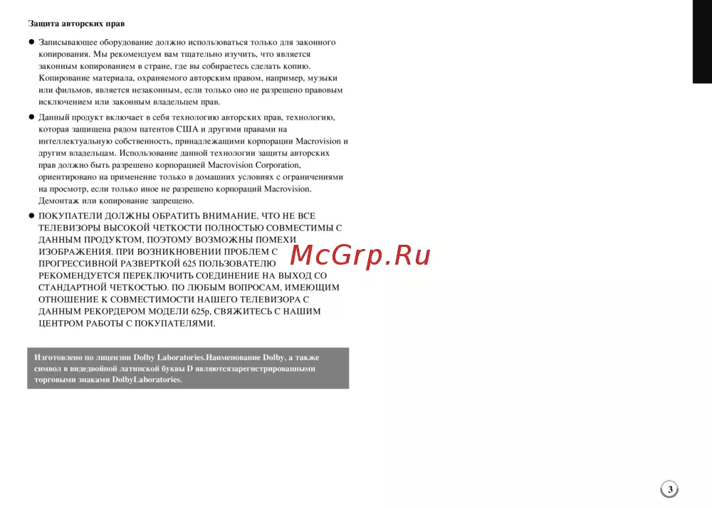Защита авторских нрав Записывающее оборудование должно использоваться только для законного копирования Мы рекомендуем вам тщательно изучить что является законным копированием в стране где вы собираетесь сделать копию Копирование материала охраняемого авторским правом например музыки или фильмов является незаконным если только оно не разрешено правовым исключением или законным владельцем прав Данный продукт включает в себя технологию авторских прав технологию которая защищена рядом патентов США и другими правами на интеллектуальную собственность принадлежащими корпорации Macrovision и другим владельцам Использование данной технологии защиты авторских прав должно быть разрешено корпорацией Macrovision Corporation ориентировано на применение только в домашних условиях с ограничениями на просмотр если только иное не разрешено корпораций Macrovision Демонтаж или копирование запрещено ПОКУПАТЕЛИ ДОЛЖНЫ ОБРАТИТЬ ВНИМАНИЕ ЧТО НЕ ВСЕ ТЕЛЕВИЗОРЫ ВЫСОКОЙ ЧЕТКОСТИ ПОЛНОСТЬЮ СО ВМЕСТИ МЫ С ДАННЫМ ПРОДУКТОМ ПОЭТОМУ ВОЗМОЖНЫ ПОМЕХИ ИЗОБРАЖЕНИЯ ПРИ ВОЗНИКНОВЕНИИ ПРОБЛЕМ С ПРОГРЕССИВНОЙ РАЗВЕРТКОЙ 625 ПОЛЬЗОВАТЕЛЮ РЕКОМЕНДУЕТСЯ ПЕРЕКЛЮЧИТЬ СОЕДИНЕНИЕ НА ВЫХОД СО СТАНДАРТНОЙ ЧЕТКОСТЬЮ ПО ЛЮБЫМ ВОПРОСАМ ИМЕЮЩИМ ОТНОШЕНИЕ К СОВМЕСТИМОСТИ НАШЕГО ТЕЛЕВИЗОРА С ДАННЫМ РЕКОРДЕРОМ МОДЕЛИ 625р СВЯЖИТЕСЬ С НАШИМ ЦЕНТРОМ РАБОТЫ С ПОКУПАТЕЛЯМИ Изготовлено по лицензии Dolby ЕаЬога опе ч Наименование Dolby а также символ в видедвойной латинской буквы D являютсязарегистрирова иными торговыми знаками Dol by La bora tories