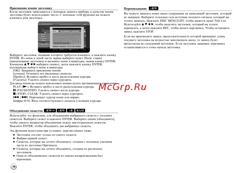Присвоение имени заголовку________________________________________________ Когда заголовок записывается с помощью данного прибора в качестве имени заголовка будет использовано число С помощью этой функции вы можете изменить имя заголовка Переписывание Вы можете записать новое видео содержание на записанный заголовок который не защищен Выберите телеканал или источник входного сигнала который вы хотите записать Нажмите DISC MENU LIST чтобы вывести меню Title List Используйте чтобы выделить заголовок который вы хотите переписать а затем нажмите REC чтобы начать перезапись Чтобы остановить запись нажмите STOP Если вы производите запись продолжительность которой превышает длину текущего заголовка на полностью заполненном диске то запись будет продолжена на следующий заголовок Если заголовок защищен перезапись останавливается в точке начала заголовка Выберите заголовок название которой требуется изменить и нажмите кнопку ENTER Из меню в левой части экрана выберите пункт Назв главы наименование заголовка и вызовите меню клавиатуры нажав кнопку ENTER Кнопками выберите символ затем нажмите кнопку ENTER подтверждая выбор в меню клавиатуры ОК Завершить присвоение имени отмена Отменить все введенные символы Пробел Вставить пробел в месте расположения курсора Удалить Удалить символ перед курсором Для ввода имени вы можете использовать кнопки пульта дистанционного управления PLAY Вставить пробел в месте расположения курсора II PAUSE STEP Удалить символ после курсора STOP CLEAR Удалить символ перед курсором Перемещает курсор влево или вправо Цифры 0 9 Ввод соответствующего символа в позиции курсора Объединение сюжетов RWVR ЕЗД ЕЛ Используйте эту функцию для объединения выбранного сюжета с соседним сюжетом Выберите сюжет и нажмите ENTER Выберите опцию объединить чтобы увидеть индикатор объединения между пиктограммами сюжетов Нажмите ENTER чтобы объединить два выбранных сюжета Эта функция недоступна при условиях перечисленных ниже Заголовок состоит только из одного сюжета Выбран первый сюжет Сюжеты которые вы хотите объединить созданы с помощью удаления части из заголовка Оригинала Сюжеты которые вы хотите объединить созданы из различных заголовков Один из объединяемых сюжетов из списка воспроизведения был перемещен 30