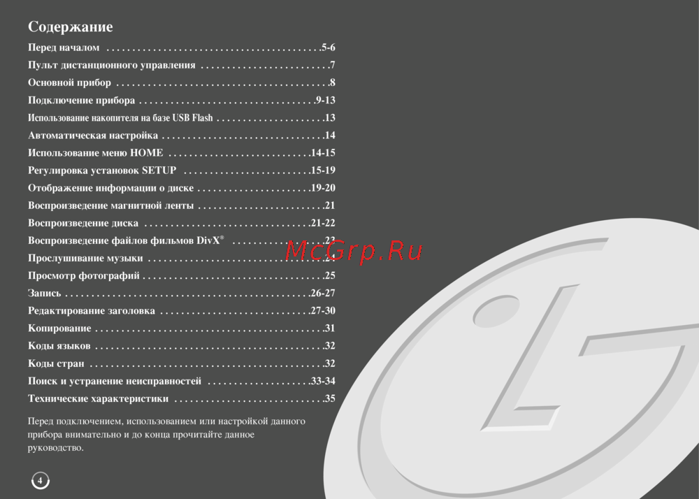 Содержание Перед началом 5 6 Пульт дистанционного управления 7 Основной прибор 8 Подключение прибора 9 13 Использование накопителя на бате USB Flash 13 Автоматическая настройка 14 Использование меню НОМЕ 14 15 Регулировка установок SETUP 15 19 Отображение информации о диске 19 20 Воспроизведение магнитной ленты 21 Воспроизведение диска 21 22 Воспроизведение файлов фильмов DivX 23 Прослушивание музыки 24 Просмотр фотографий 25 Запись 26 27 Редактирование заголовка 27 30 Копирование 31 Коды языков 32 Коды стран 32 Поиск и устранение неисправностей 33 34 Технические характеристики 35 Перед подключением использованием или настройкой данного прибора внимательно и до конца прочитайте данное руководство