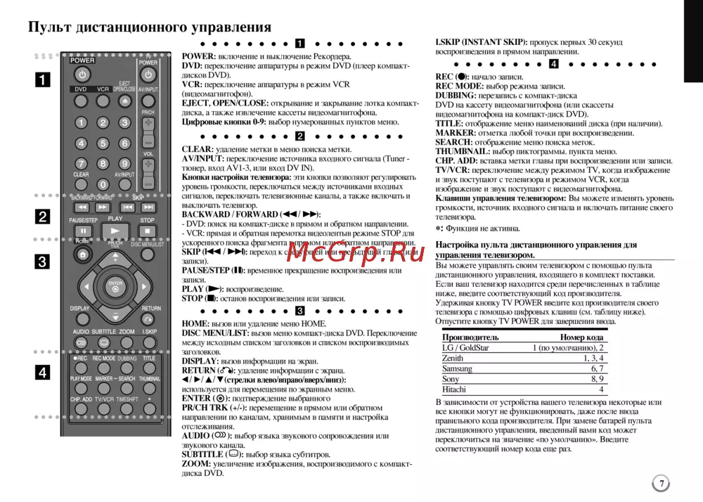 Пульт дистанционного управления п POWER включение и выключение Рекордера DVD переключение аппаратуры в режим DVD плеер компактдисков DVD VCR переключение аппаратуры в режим VCR видеомагнитофон EJECT OPEN CLOSE открывание и закрывание лотка компактдиска а также извлечение кассеты видеомагнитофона Цифровые кнопки 0 9 выбор нумерованных пунктов меню в CLEAR удаление метки в меню поиска метки AV INPUT переключение источника входной сигнала I nner тюнер вход AV1 3 или вход DV 1N Кнопки настройки тслевиюра эти кнопки позволяют регулировать уровень громкости переключаться между источниками входных сигналов гереключать телевизионные каналы а также включать и вы кл ючать телевизор BACKWARD FORWARD DVD поиск на компакт диске в прямом и обратном направлении VCR прямая и обратная перемотка видеоленгыв режиме STOP для ускоренного поиска фрагмента в прямом или обратном направлении SKIP М переход к следующей или предыдущей главе или записи PAUSESTEP II временное прекращение воспроизведения или записи PLAY воспроизведение STOP останов воспроизведения или записи н НОМЕ вызов или удаление меню НО VIE DISC MENL7LIST вызов меню компакт диска DVD Переключение между исходным списком заголовков и списком воспроизводимых заголовков DISPLAY вызов информации на экран RETURN Г удаление информации с экрана А стрелки влево вправо вверх вниз используется для перемещения по экранным меню ENTER подтверждение выбранной PR CH TRK перемещение в прямом или обратном направлении по каналам хранимым в памяти и настройка отслеживания AUDIO О выбор языка звуковой сопровождения или ЗЕукового канала SUBTITLE О выбор языка субтитров ZOOM увеличение изображения воспроизводимогос компактдиска DVD I SKIP INST АУТ SKIP пропуск первых 30секунд воспроизведения в прямом направлении REC начало записи REC MODE выбор режима записи DUBBING перезапись с компакт диска DVD на кассету видеомагнитофона или скассеты видеомагнитофона на компакт диск DVD TITLE отображение меню наименований диска при наличии MARKER отметка любой точки при воспроизведении SEARCH отображение меню поиска меток THUMBNAIL выбор пиктограммы пункта меню СНР ADD вставка метки главы при воспроизведении или записи TV VCR переключение между режимом TV когда изображение и звук поступают с телевизора и режимом VCR когда изображение и звук поступают с видеомагнитофона Клавиши управления телевизором Вы можете изменять уровень громкости источник входной сигнала и включать питание своей телевизора Функция не активна Настройка пульта дистанционного управления для управления телевизором ____________________________________ Вы можете управлять своим телевизором с помощью пульта дистанционной управления входящей в комплект поставки Если ваш телевизор находится среди перечисленных в таблице ниже введите соответствующий код производителя Удерживая кнопку TV POWER введите код производителя своего телевизора с помощью цифровых клавиш см таблицу ниже Отпустите кнопку IV POWER для завершения ввода Производитель_________________ Номер кода LG GoldStar____________ 1 по умолчанию 2 Zenith________________________________1 3 4 Samsung_______________________________ 6 7 Sony__________________________________8 9 Hitachi 4 В зависимости от устройства вашего телевизора некоторые или все кнопки могут не функционировать даже после ввода правильной кода производителя При замене батарей пульта дистанционной управления введенный вами код может переключиться на значение по умолчанию Введите соответствующий номер кода еще р