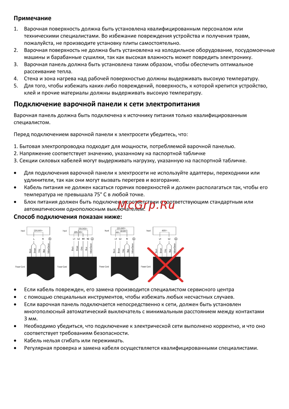 Варочная панель должна быть подключена к источнику питания только квалифицированным