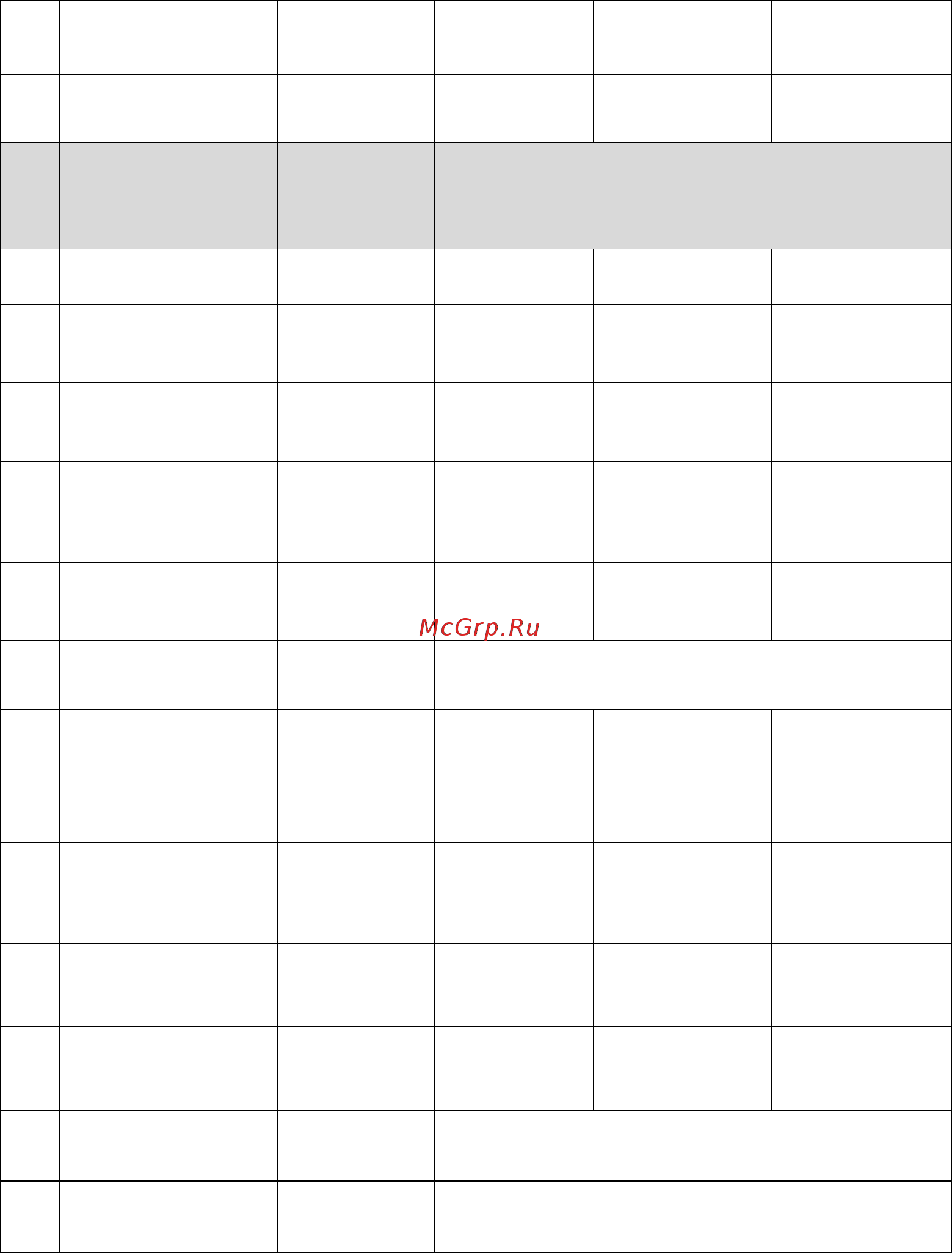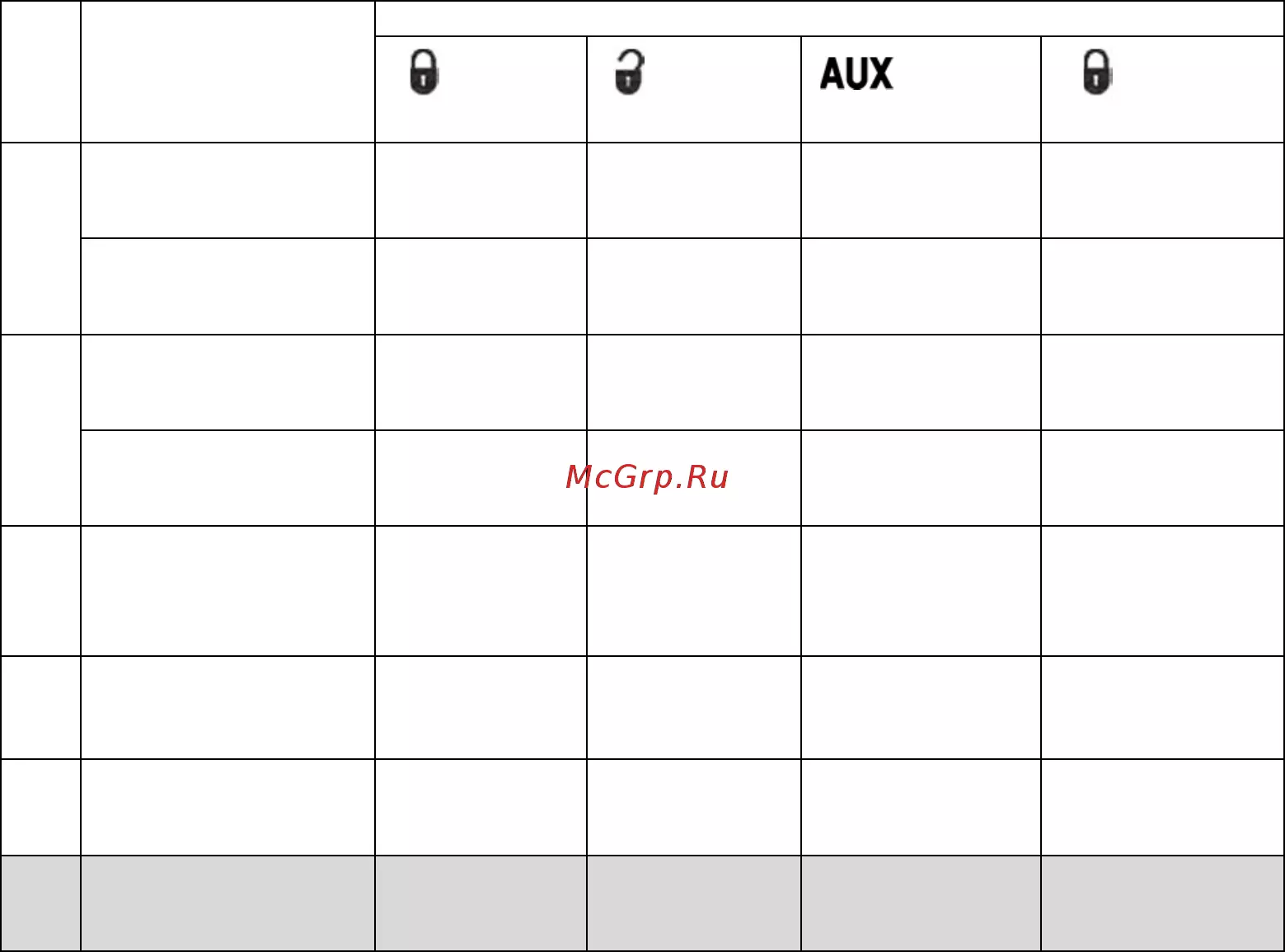 Заводские установки выделены жирным, добавленные функции выделены серым фоном.
