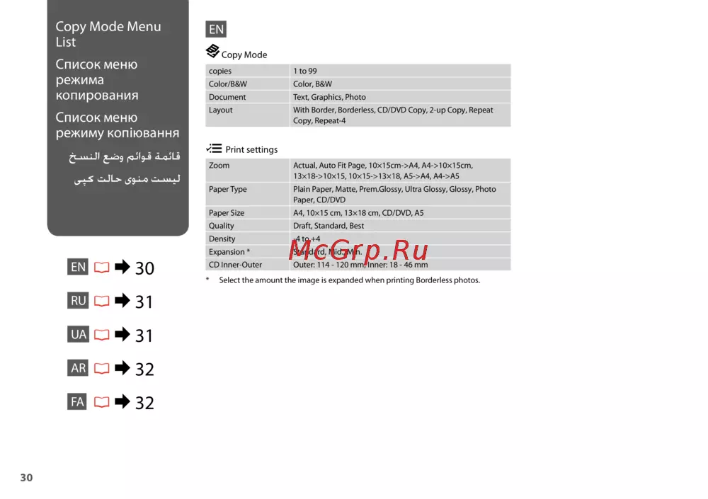 Epson Stylus Photo TX659 [30/88] Список меню режима копирования