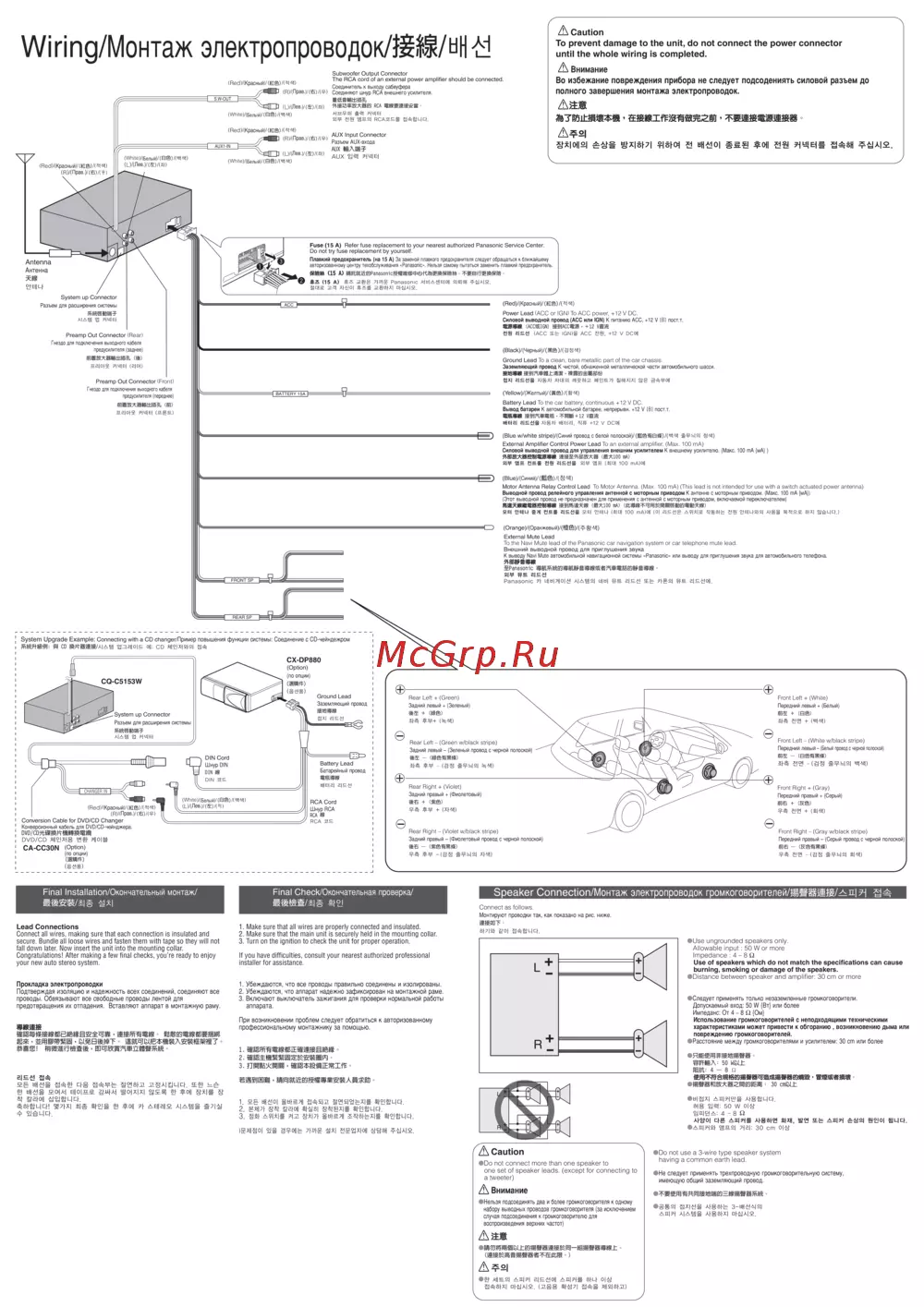 А Caution То prevent damage to the unit do not connect the power connector until the whole wiring is completed Wiring Монтаж электропроводок А Внимание Во избежание повреждения прибора не следует подсодениять силовой разъем до полного завершения монтажа электропроводок Subwoofer Output Connector The RCA cord of an external power amplifier should be connected АеЬ Красный Н6 АЯ М R flpaB ffi Соединитель к выходу сабвуфера Соединяют шнур RCA внешнего усилителя и Лев у а бЯЙЖЙЯ ЯЖИЖИХВГО МА ВЙЯВЙЙв S WOUT А Ж Л1й Ч 84 ЯШИ за зая рсдэ ё White Eenb8Ö eS l 4 РеЬ КрасныйУ Я А1АЧ Разъем AUX входа AUX ИЛИ Е Лев у И ММе Белый В ЭД ЬУ Лев 5 а Red KpacHbiK H6 4 M А 2 SXKHM М1Л З 7 AUX Input Connector П Прав Т5 AUX1 IN явкя а ин о oil as А 2 AUX 33 ЗЗЧ White ИБелый ев ЭД Н ДПрав У 6 Fuse 15 A Refer fuse replacement to your nearest authorized Panasonic Service Center Do not try fuse replacement by yourself Плавкий предохранитель на 15 А Зазаменэй ПЛЭЕЮГО предохран игеля следует обращаться к ближайшему авторизованному центру техобслуживания Panasonic Нельзя самому пытаться заменить плажий гредохранитель Antenna Антенна R 15 А ФЯВЙШЯЯ 15 A Si ZWIS Panasonic Alи ЛАШЕТоц ЯЯЯ t A 2 Sens лги xtAJoi SS a sfx oft A 2 2JEi L System up Connector Пеб КрасныйУ Нй ДЧ Ч Разъем для расширения системы Power Lead ACC or IGNI To ACC power 12 V DC ШВВИ А да S ЯЧЯ Силовой выводной провод ACC или IGN К питанию ACC 12 V Bl поег т ACCSIGN Й1АССЯЯ 12 УВЯ аз ЯЕЗ АСС at IGNIS дес aa 12 v DCOII Preamp Out Connector Rear Гнездо для пэдключения выходного кабеля предусилителя заднее В1аск Черный ЖЙ 1 044 Ground Lead То a clean bare metallic part of the car chassis aaois ЯЧН ЯО Заземляющий провод К чистой обнаженной металлической части автомобильного шасси К В ИЯ5ЙЬЯЖ ЯЯ0Э ИВ1ЯЙ axi я паз Я8 яшя ия8 л шаая аяяя аг SA OI Preamp Out Connector Front Гнездо для годолючения выходного кабеля предусилителя переднее BATTERY 15A УеПотУ Желтый Я Ч Battery Lead То the car battery continuous 12 V DC BW 88 Sl iffi5l Я Вывод батареи К автомобильной батарее непрерывн 12 V В поег т И Ж ФИ 12 VB3S aaots ЯМИ а 8 вняя ЯнаЗЯбЯ Щ Я 12 V DC0I Blue w whitestripe CHH провод с белой полоской Е аИ5 1 1 Э ЧЯ 1 External Amplifier Control Power Lead To an external amplifier Max 100 mA Силовой выводной провод для управления внешним усилителем К внешнему усилителю Макс 100 mA мА gflSKXSS ЯХШ mA Я 35 Эа ЯнаЗ Я 85 ЯШ 100 тА 0 В1ие Синий ЕЙ 8 Ч Motor Antenna Relay Control Lead To Motor Antenna Max 100 mA This lead is not intended for use with a switch actuated power antenna Выводной провод релейного управления антенной с моторным приводом К антенне с моторным приводом Макс 100 mA мА Этот выводной провод не предназначен для применения с антенной с моторным приводом включаемой переключателем BBSS ВЛ100 mA аа ощц SXI USf a d3 ан унт ЯСИ 100 тА 0 01 анtfg Aoj g sa fBI te ASs 8fx ВвМЧ CD Огапде Оранжевый й й External Mute Lead To the Navi Mute lead of the Panasonic car navigation system or car telephone mute lead Внешний выводной провод для приглушения звука К выводу Navi Mute автомобильной навигационной системы Panasonic или выводу для приглушения звука для автомобильного телефона SPanasonfc Ш 8 1Ш в9а вПа Яв9И В9 1 Я ЙЕ ВЕУ Panasonic Я mullóla А ДИ Ц Щ йа e S 3 Её Я 2 ЙЕ S И01 System Upgrade Example Connecting with a CD changer Пример повышения функции системы Соединение с CD чейндежром 5 СО ЙЙ Й А ДЗ 9ла 0 о CD AII2JxfStS а CX DP880 Option по опции CQ C5153W ЯВЙ SA S System up Connector Ground Lead Rear Left Green Front Left White Заземляющий провод Задний левый Зеленый Передний левый Белый sœw ï Ий fflï В ах г а Разъем для расширения системы g as ЩА л лы а ЯЧЯ DIN Cord Шнур DIN Battery Lead OIN В Батарейный провод OIN 3 ЖКНЯЖ нныг г а AULER II УУЬ е ДБ 1ый Ве ЯЧ и Лев г Ч Реб КрасныйУ Ж1в 1 Ч Р Гфав У б RCA Cord Шнур RCA RCA Й1 RCA 3 Conversion Cable for DVD CD Changer Конверсионный кабель для DVD CD чейнджера Hear Lett Green w black stripe Front Left White w black stripe Задний левый Зеленый провод с черной полоской Передний левый Бе1ыйпрдоодс черней подоской ИЙ И а gg S ysi ЭД яга в вж Rear Right Violet Front Right Gray Задний правый