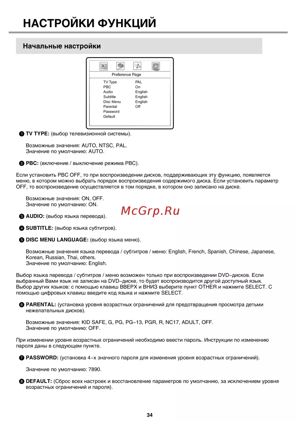 7 PASSWORD: (установка 4−х значного пароля для изменения уровня возрастных ограничений).