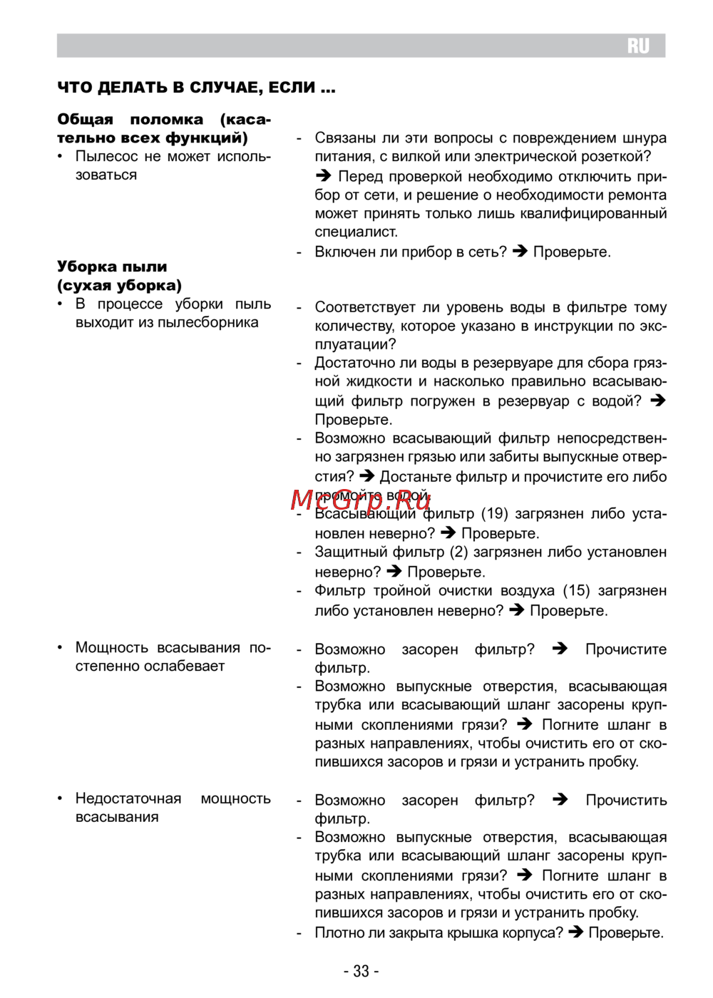 ни ЧТО ДЕЛАТЬ В СЛУЧАЕ ЕСЛИ Общая поломка каса тельно всех функций Пылесос не может исполь зоваться Уборка пыли сухая уборка В процессе уборки пыль выходит из пылесборника Связаны ли эти вопросы с повреждением шнура питания с вилкой или электрической розеткой Перед проверкой необходимо отключить при бор от сети и решение о необходимости ремонта может принять только лишь квалифицированный специалист Включен ли прибор в сеть Проверьте Соответствует ли уровень воды в фильтре тому количеству которое указано в инструкции по экс плуатации Достаточно ли воды в резервуаре для сбора гряз ной жидкости и насколько правильно всасываю щий фильтр погружен в резервуар с водой Проверьте Возможно всасывающий фильтр непосредствен но загрязнен грязью или забиты выпускные отвер стия Достаньте фильтр и прочистите его либо промойте водой Всасывающий фильтр 19 загрязнен либо уста новлен неверно Проверьте Защитный фильтр 2 загрязнен либо установлен неверно Проверьте Фильтр тройной очистки воздуха 15 загрязнен либо установлен неверно Проверьте Мощность всасывания по степенно ослабевает Возможно засорен фильтр Прочистите фильтр Возможно выпускные отверстия всасывающая трубка или всасывающий шланг засорены круп ными скоплениями грязи Погните шланг в разных направлениях чтобы очистить его от ско пившихся засоров и грязи и устранить пробку Недостаточная мощность всасывания Возможно засорен фильтр Прочистить фильтр Возможно выпускные отверстия всасывающая трубка или всасывающий шланг засорены круп ными скоплениями грязи Погните шланг в разных направлениях чтобы очистить его от ско пившихся засоров и грязи и устранить пробку Плотно гм закрыта крышка корпуса Проверьте 33