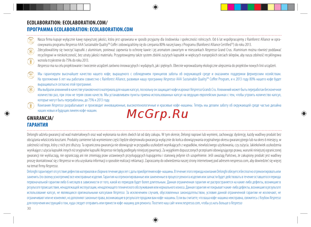 ограничивают или не изменяют, но дополняют законные права, возникающие в результате продажи вам кофе-машины. Если вы считаете, что ваша кофе-машина неисправна, свяжитесь с Клубом Nespresso