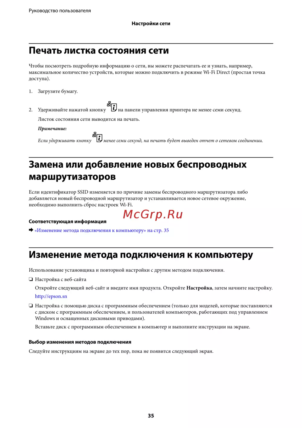 & «Изменение метода подключения к компьютеру» на стр. 35