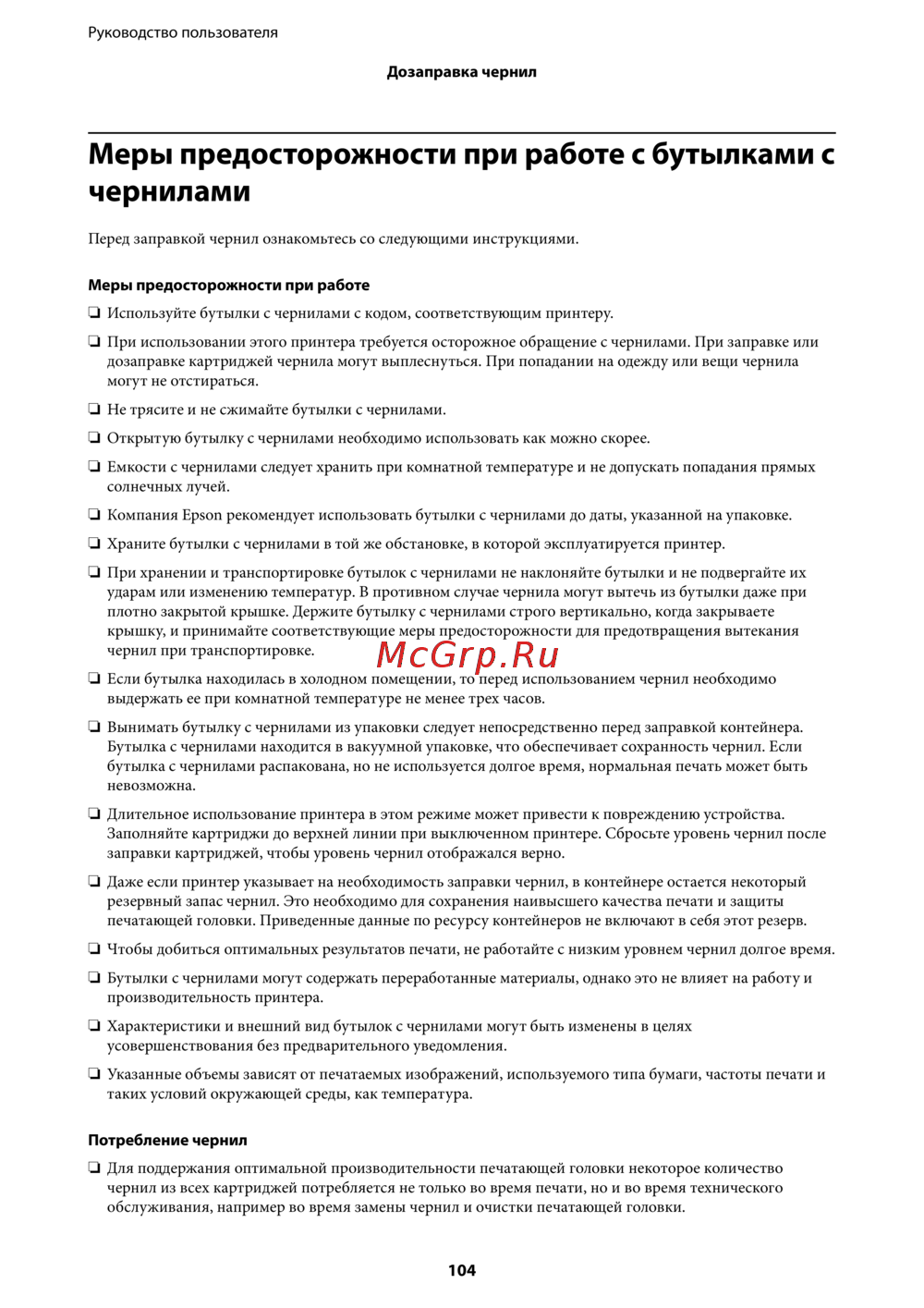 ❏ При использовании этого принтера требуется осторожное обращение с чернилами. При заправке или
