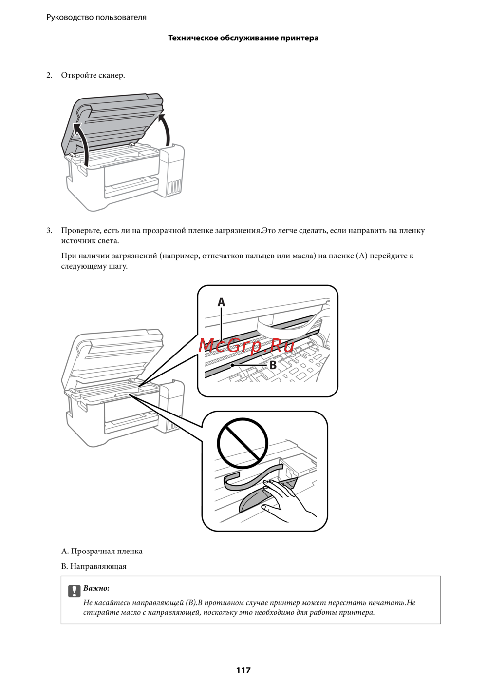 Не касайтесь направляющей (В).В противном случае принтер может перестать печатать.Не