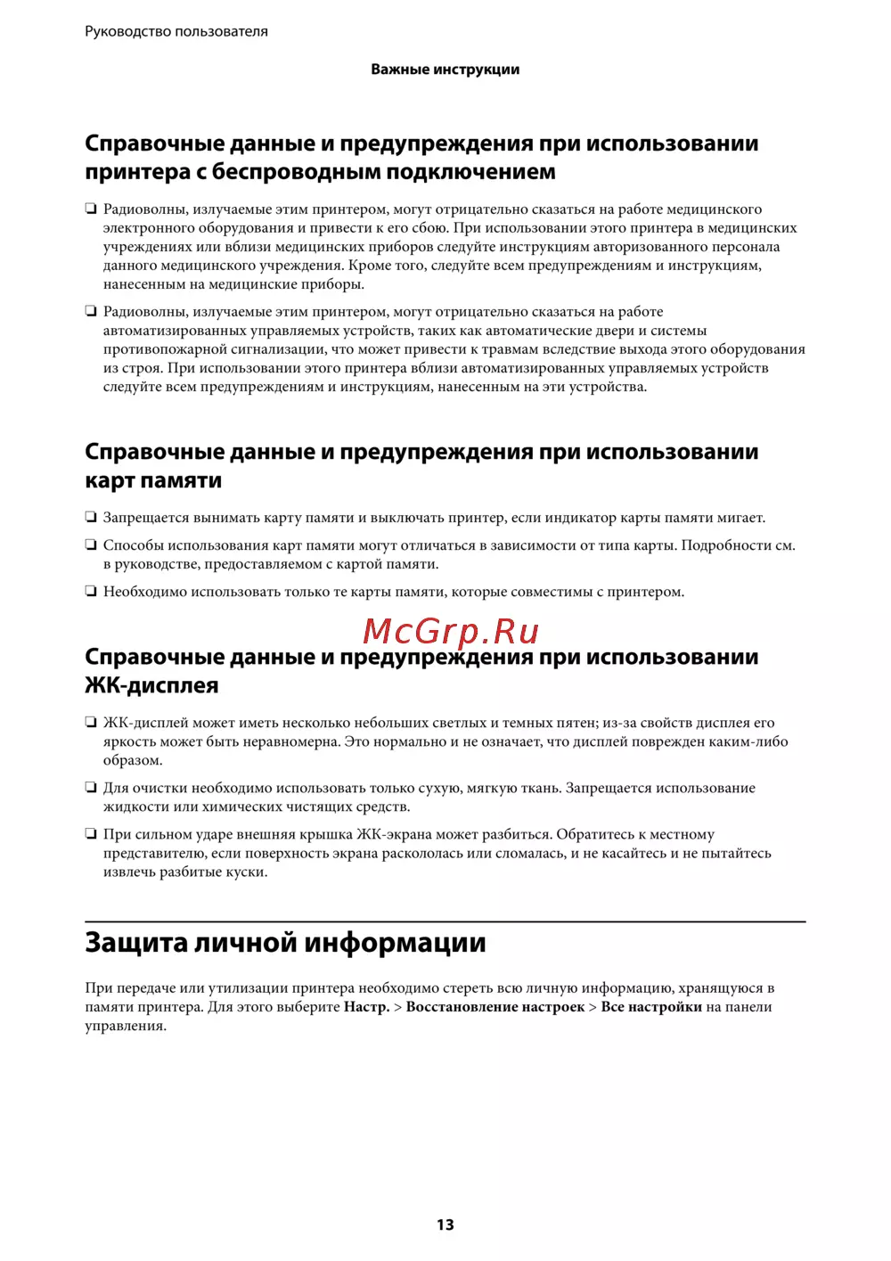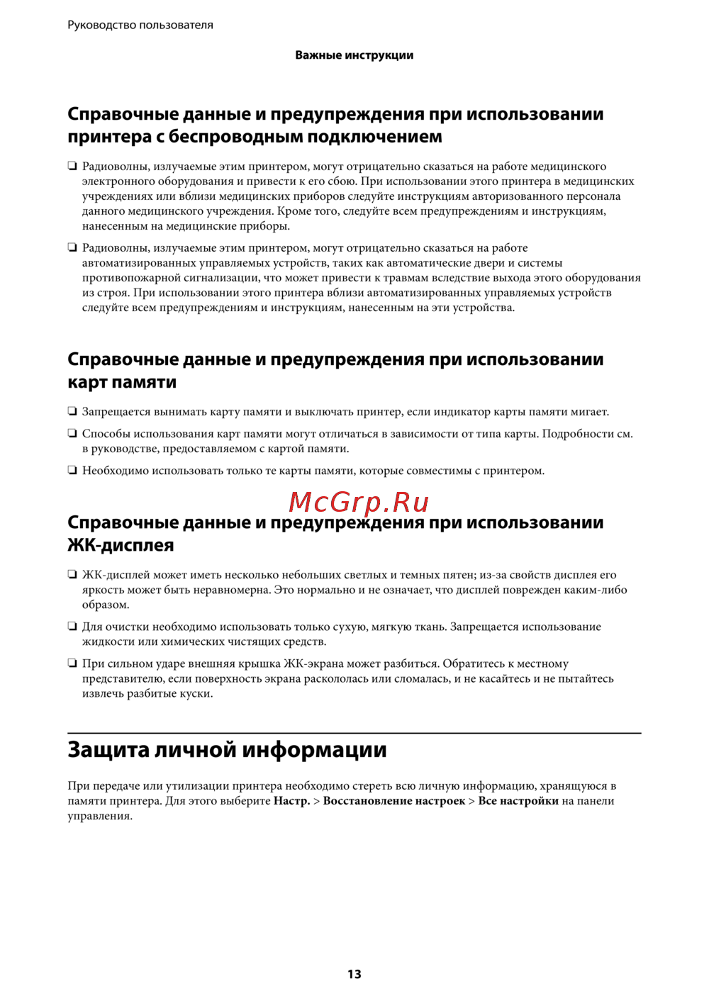 Epson L4167 — предупреждения и рекомендации по использованию беспроводного принтера [13/181]