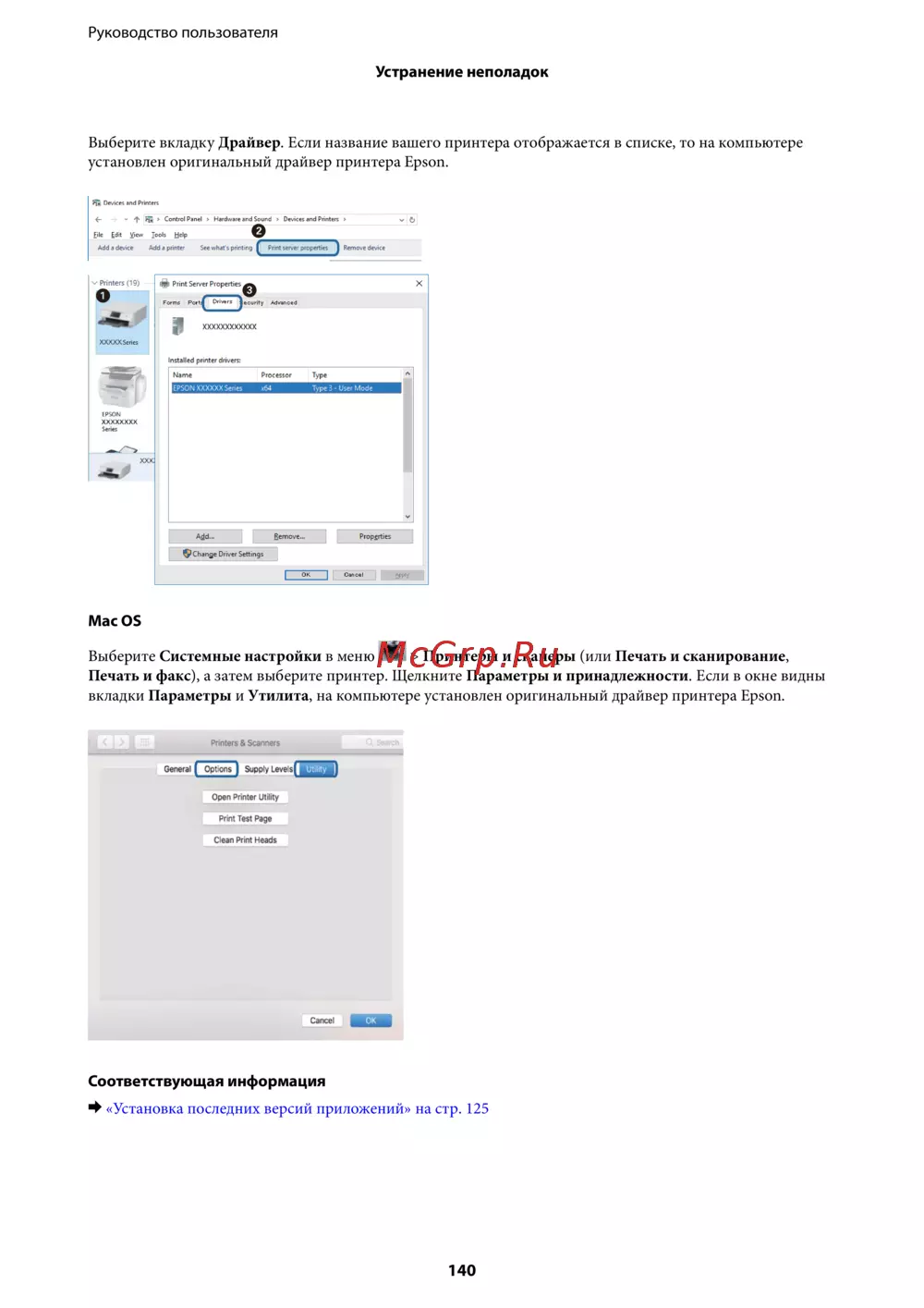 вкладки Параметры и Утилита, на компьютере установлен оригинальный драйвер принтера Epson.