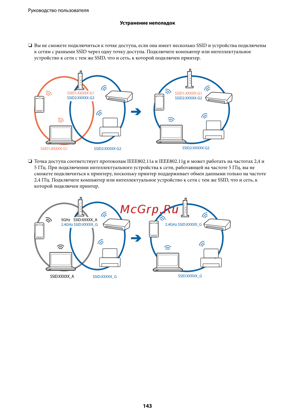 ❏ Вы не сможете подключиться к точке доступа, если она имеет несколько SSID и устройства подключены