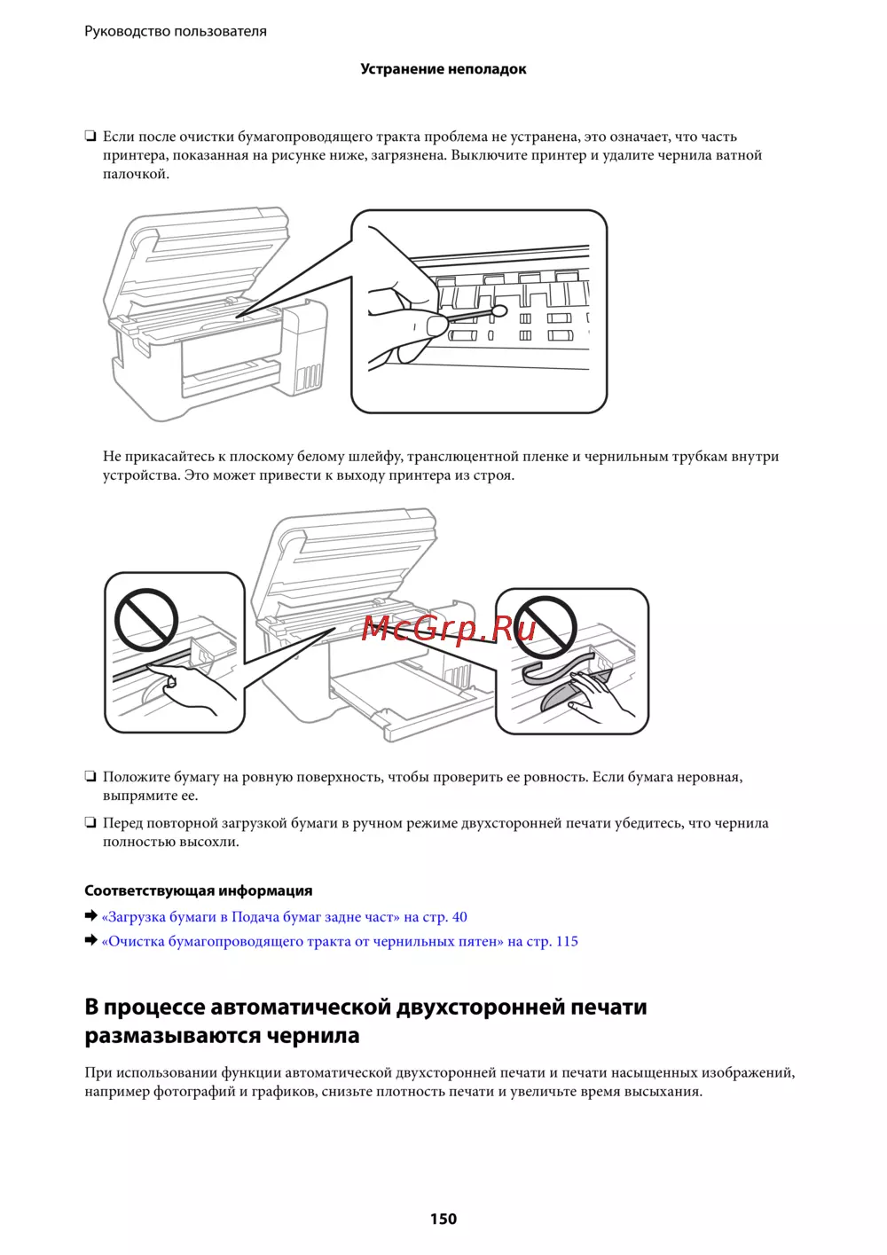❏ Перед повторной загрузкой бумаги в ручном режиме двухсторонней печати убедитесь, что чернила