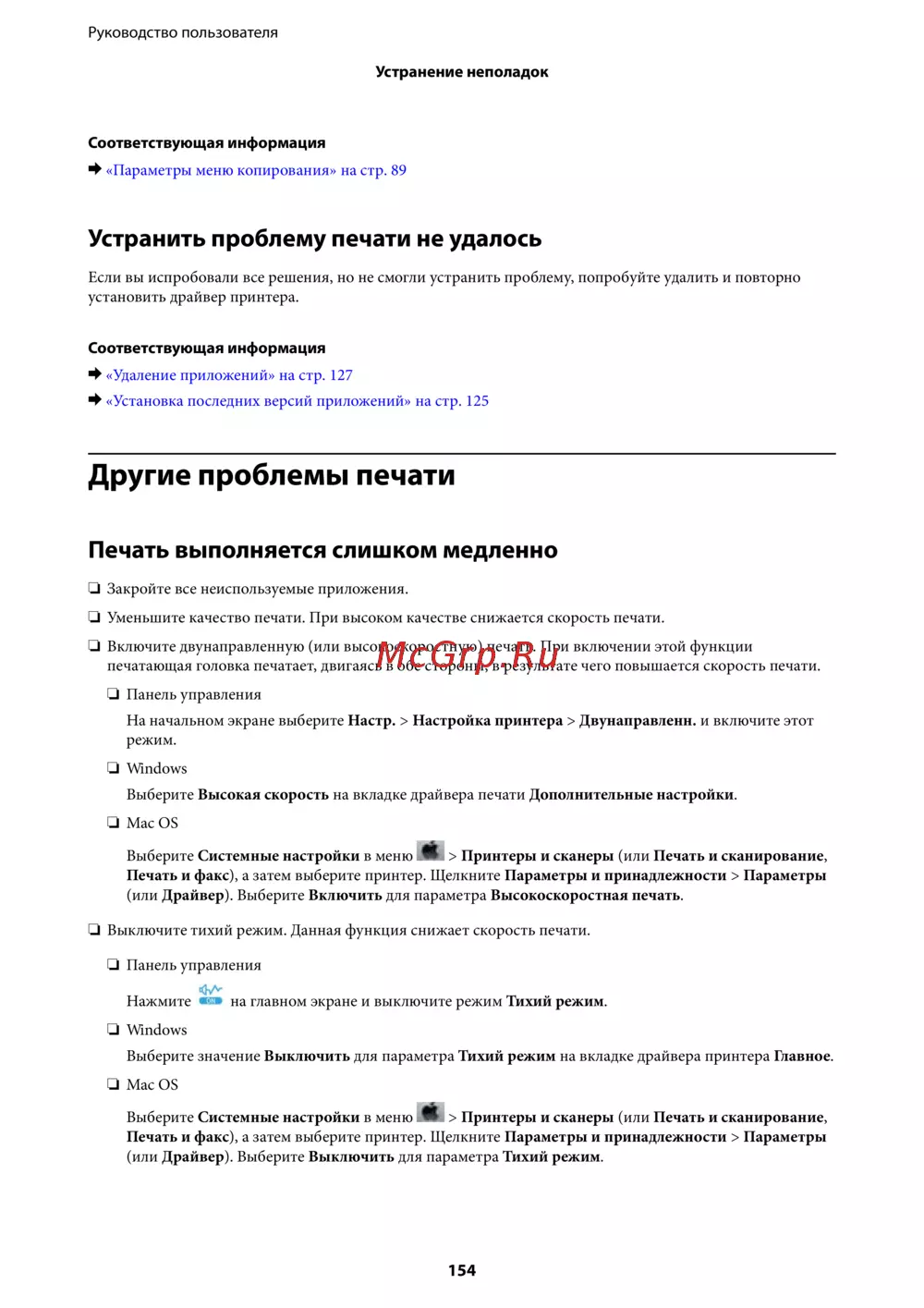 ❏ Выключите тихий режим. Данная функция снижает скорость печати.
