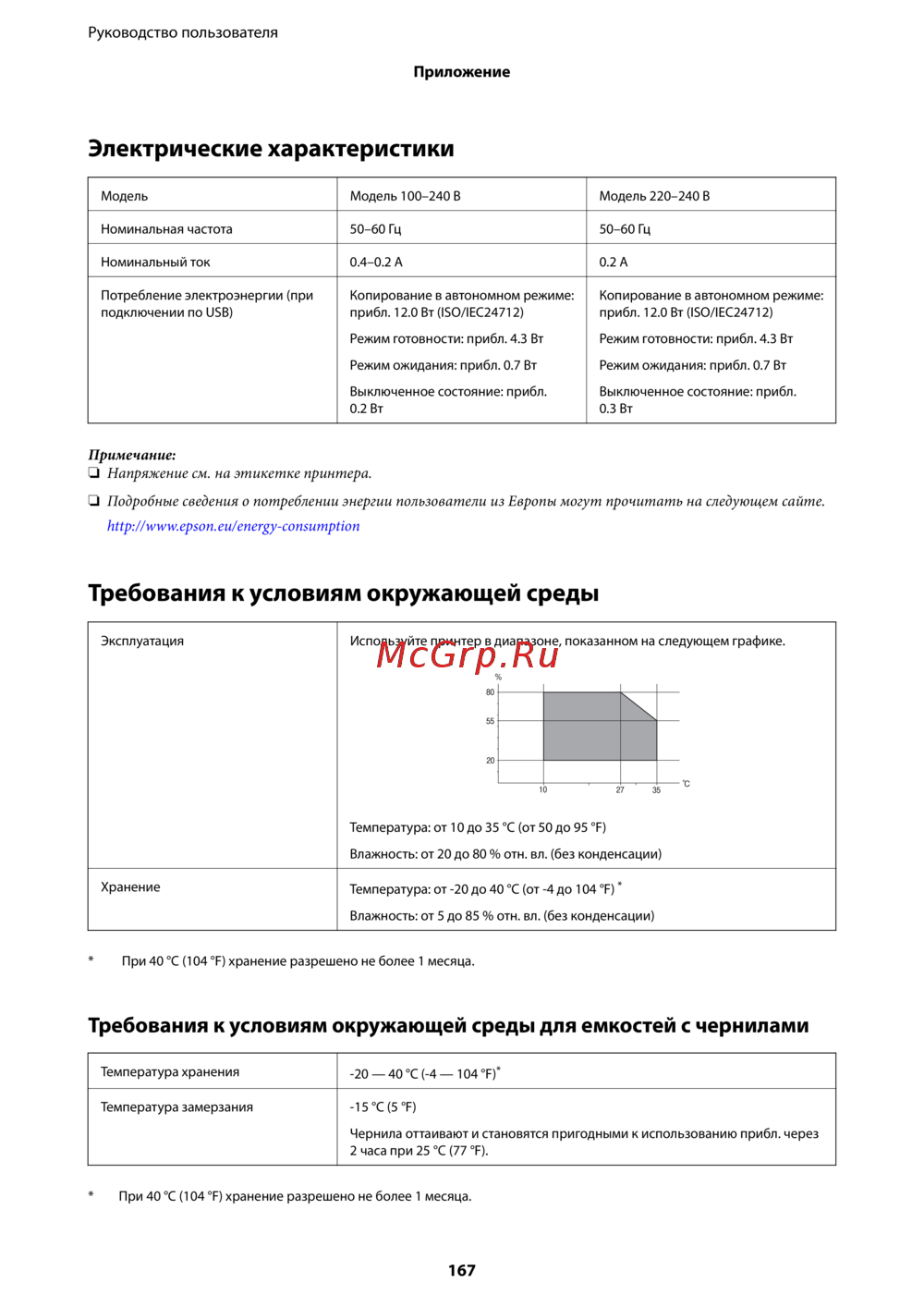 Epson L4167 — электрические характеристики и условия эксплуатации принтера [167/181]