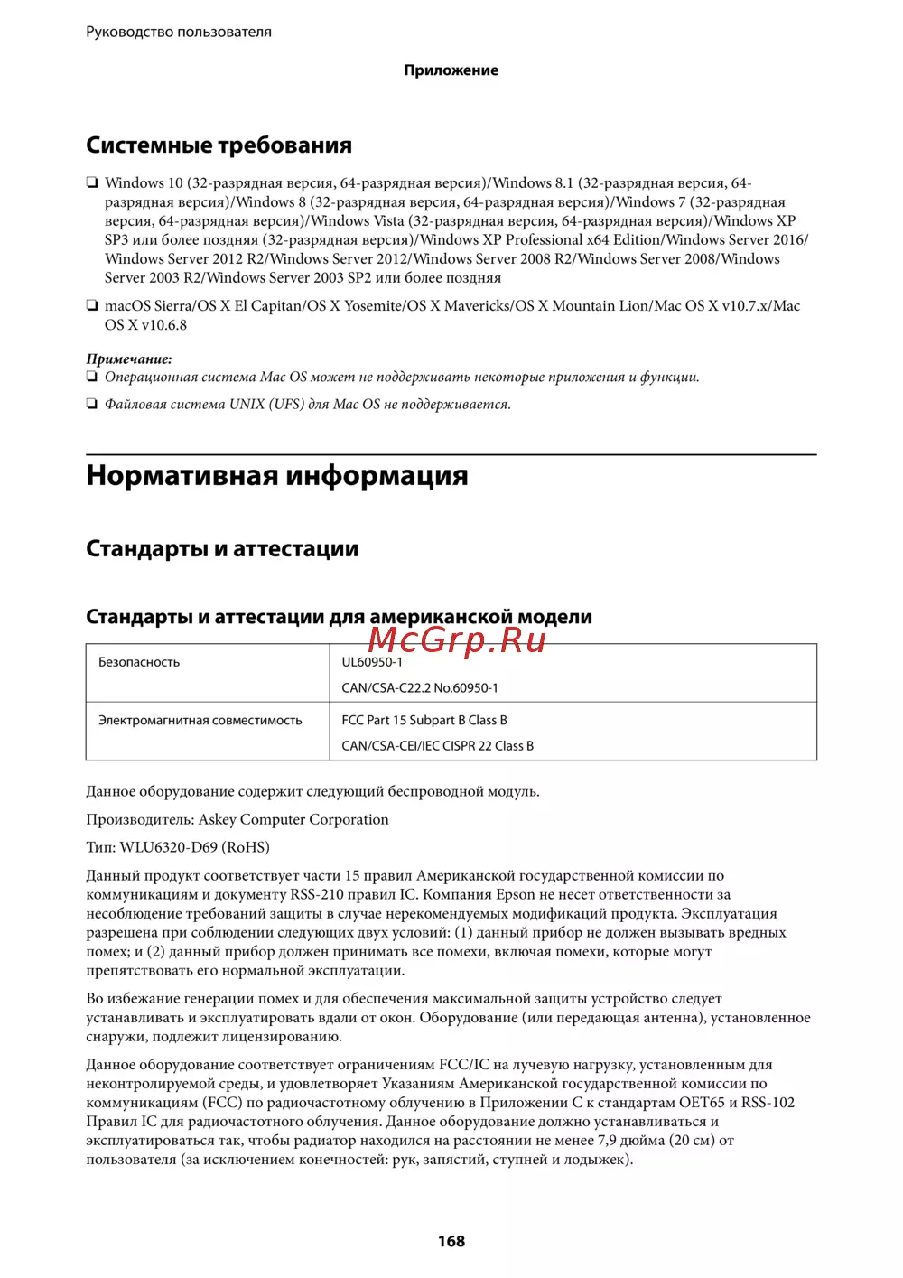 Узнайте системные требования для Windows и macOS, а также информацию о безопасности и электромагнитной совместимости. Подробности о поддерживаемых версиях и стандартах.