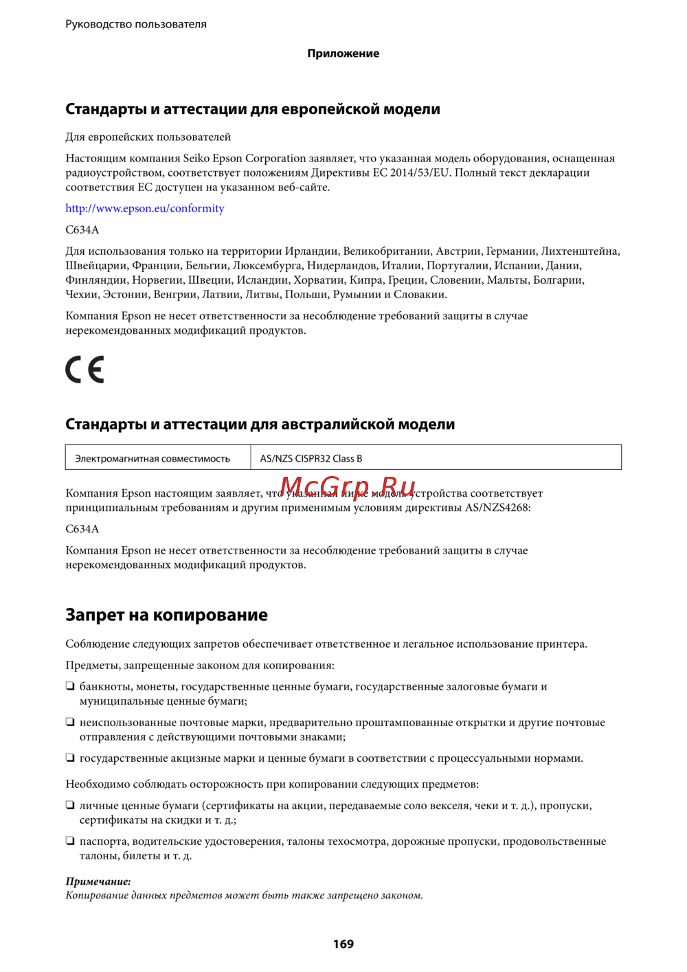 - Нарушение легального использования принтера может произойти при неправильном копировании авторских материалов за исключением случаев действия по совету компетентного юриста необходимо получить разрешение на копирование таких материалов от владельца авторского права p.170