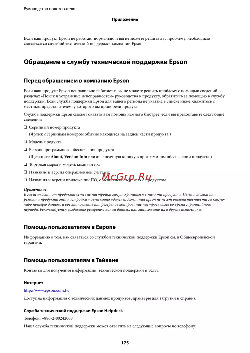 - Обращение в службу технической поддержки epson p.175