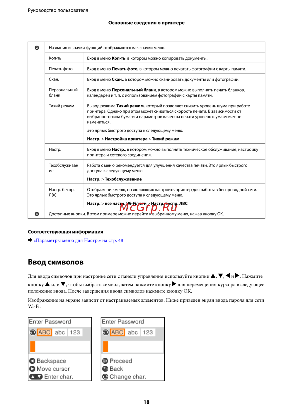 - Для ввода символов при настройке сети с панели управления используйте кнопки p.18