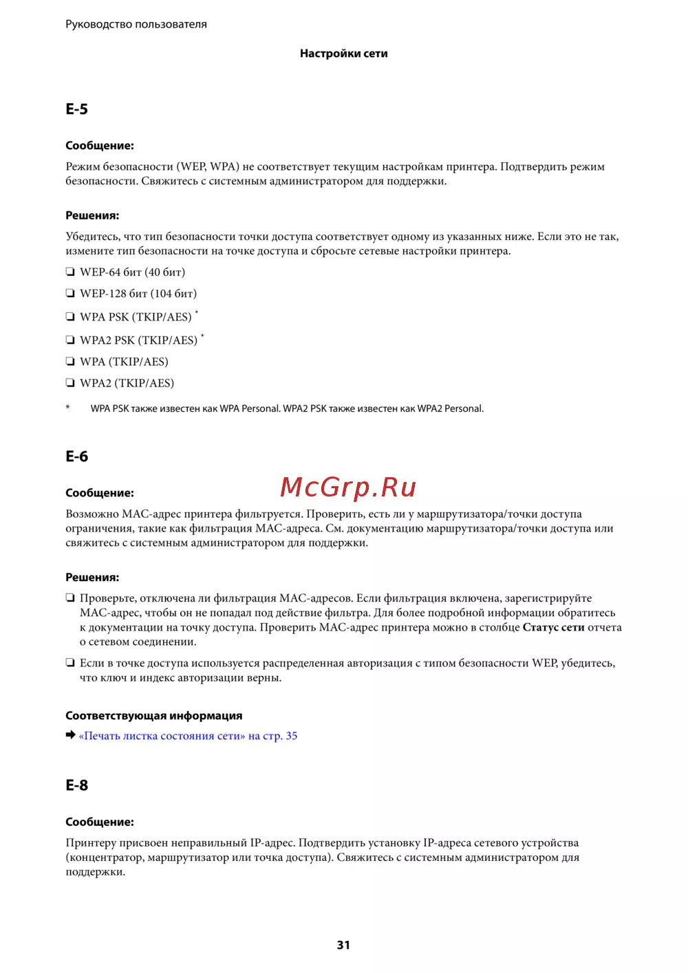 Режим безопасности (WEP, WPA) не соответствует текущим настройкам принтера. Подтвердить режим
