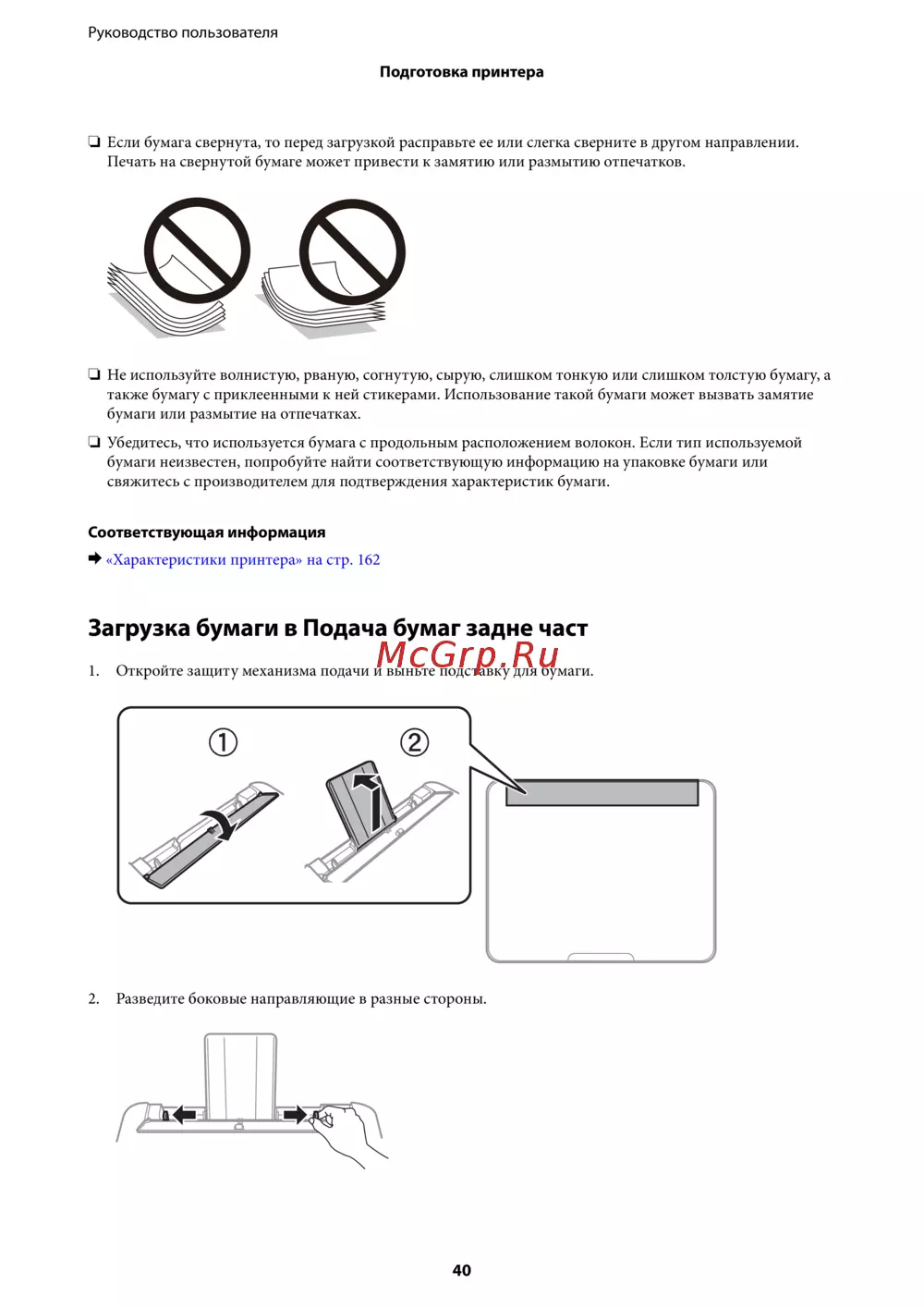 ❏ Если бумага свернута, то перед загрузкой расправьте ее или слегка сверните в другом направлении.